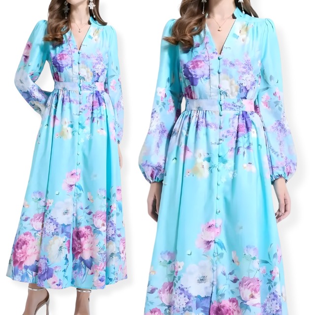 送料無料 ◆ D2497 フラワー 胡桃ボタン 前開き Vネック バルーンスリーブ ロング ワンピース《 ライトブルー×パープル 》 花柄 クラシカルラベンダー スカイブルー ライトブルー フラワー ボタン 袖あり クラシック 柄物ワンピース 柄ワンピース 柄物 レトロ ヴィンテージ風 ワンピース クラシックワンピース ドレスワンピース 袖あり ミモレ 膝下 膝下丈 ワンピース お呼ばれ おしゃれ 衣装 おでかけ エレガント ベルトセット 上品 カジュアル メール便
