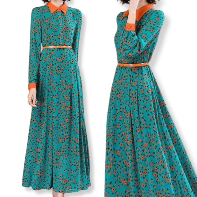 送料無料 ◆ D2468 オレンジベルト付き オレンジ襟 胡桃ボタン フラワー 長袖 ロング ドレス ワンピース《 グリーン×オレンジ 》 グリーンドレス 緑ワンピース レトロ クラシカルワンピース インポートワンピース 上品 パーティードレス メール便 パーティーワンピ お食事 ロングスリーブ おしゃれ 袖あり 衣装 エレガント オケージョン オケージョンドレス レトロワンピ ベルトセット お出かけ