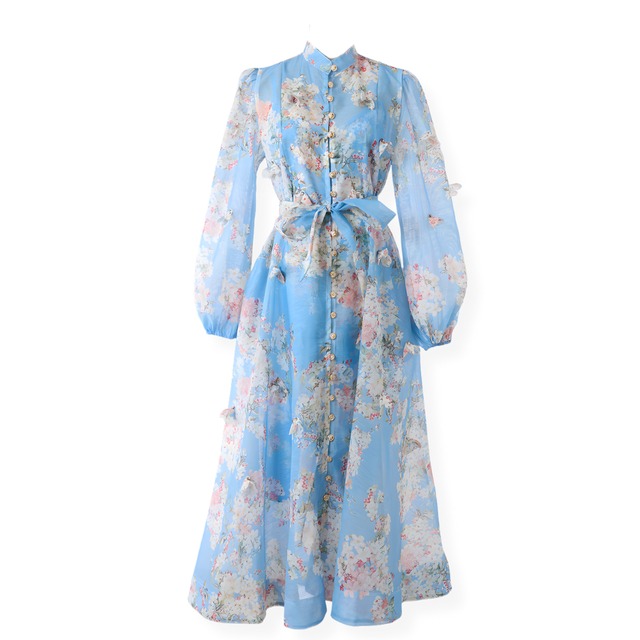送料無料 ◆ D2598 ペチコート &リボン付き カメリアボタン 花柄 フラワー ビジュー 装飾 前開き バルーンスリーブ ロング ワンピース《 ホワイト×ブルー 》カラフル 桜 サクラ 桜柄 クラシカルボタン ゴールドボタン 花柄 クラシカルボタン ボタン 袖あり クラシック 柄物ワンピース 柄ワンピース 柄物 レトロ ヴィンテージ風 ワンピース クラシックワンピース ドレスワンピース 袖あり ミモレ 膝下 膝下丈 ワンピース お呼ばれ おしゃれ 衣装 おでかけ エレガント 上品 カジュアル