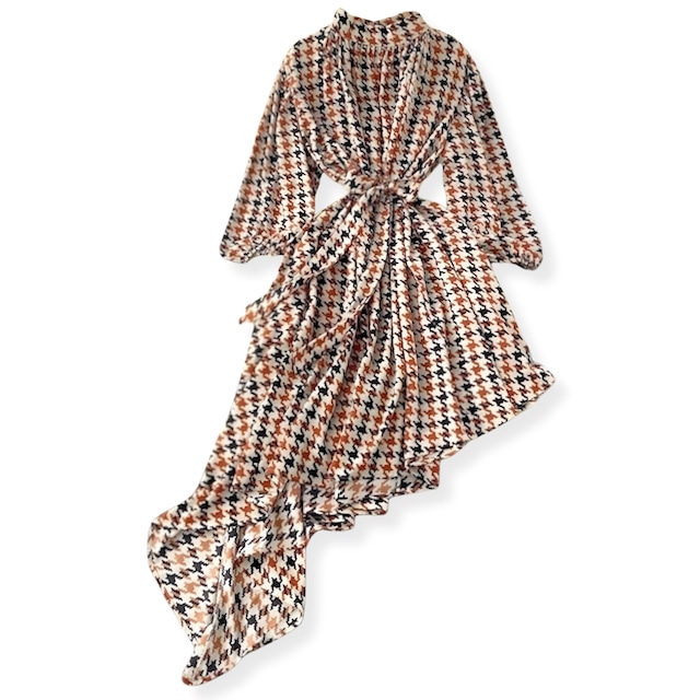 送料無料 ◆ D1704 ウエストリボン付き アシンメトリー スタンドネック ガンクラブチェック ワンピース《ベージュ》アシメ リボン付き ウエスト紐 ブルー 千鳥格子 チェックトップス ブラウス ロングブラウス ミニワンピース ブラックブラウス モード ファッション グリーンブラウス シャツ フリルブラウス 無地 トップス フリル袖 インポート カジュアル メール便 カジュアル モード おしゃれ お出かけ お呼ばれ 衣装 アシメブラウス《唯月ふうかさんご着用》