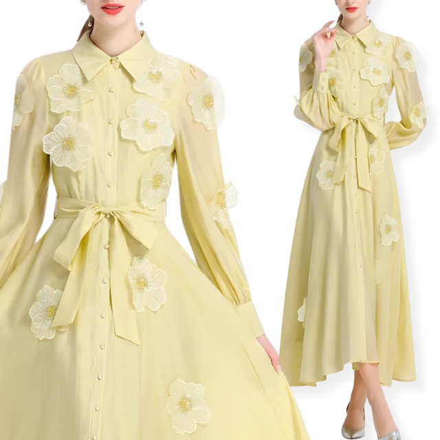 送料無料 ◆ D2566 リボン付き 立体 刺繍 フラワー モチーフ パールボタン 長袖 前開き ドレス ワンピース《 クリームイエロー 》 白ワンピース ホワイト 白 白ワンピ クラシカル インポートワンピース 膝丈 インポートワンピース メール便 裏地あり 上品 エレガント マキシ ロング パーティー 衣装 ワンピ インポートドレス