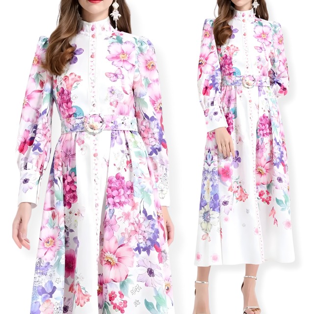 送料無料 ◆ D2580 ベルト付き フラワー 胡桃ボタン 前開き クラシカル ロング ワンピース《ホワイト×パープルピンク》花柄 ラグランスリーブ クラシカル ブラック 黒 白 ベージュ ロングワンピース エレガント アニマル柄 レオパード柄 ロングワンピ クラシック ヴィンテージ ロング インポートワンピース お呼ばれ パーティードレス メール便 パーティーワンピ 袖付き お呼ばれワンピース マキシ 長袖 インポートワンピース お呼ばれ 上品 パーティー 衣装 柄物 柄ワンピース