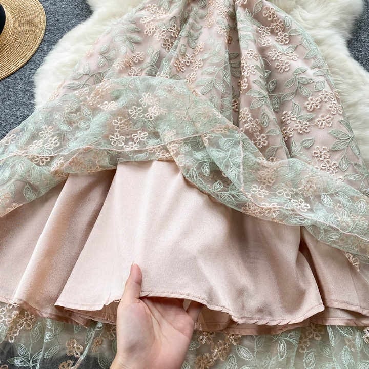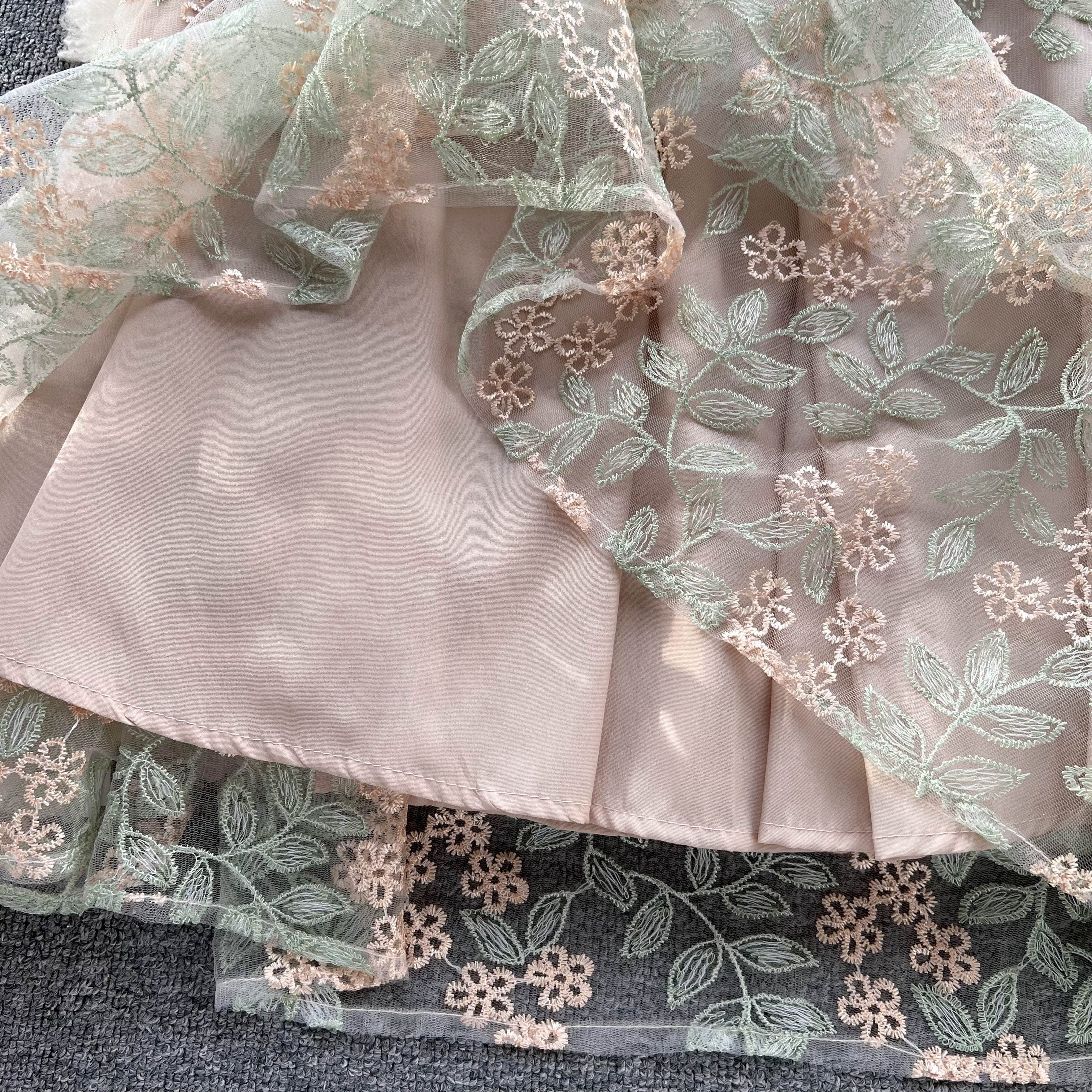 送料無料 ◆ D2211 ピーチ ミント 小花 刺繍 パールボタン パフスリーブ フレアワンピース《 シェルピンク 》花刺繍 花柄 ミント ライトグリーン ピンク インポートワンピース パーティードレス 衣装 メール便 卒業パーティー 同窓会 謝恩会 発表会 お食事 上品 清楚