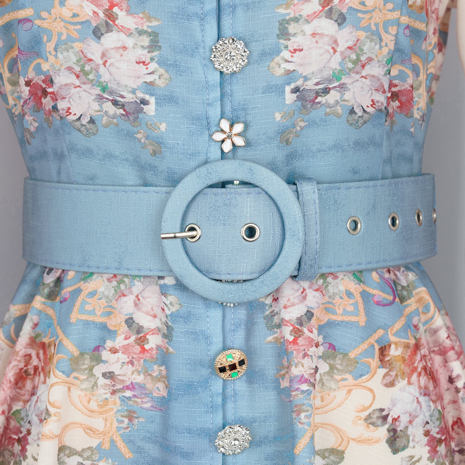 《訳ありアウトレット》送料無料 ◆ D2105 ベルト付き マルチボタン 花柄 前開き バルーンスリーブ ロング ワンピース《 オフホワイト×ライトブルー 》カラフル ボタン色々 色々ボタン 花柄 クラシカルボタン ボタン 袖あり クラシック 柄物ワンピース 柄ワンピース 柄物 レトロ ヴィンテージ風 ワンピース クラシックワンピース ドレスワンピース 袖あり ミモレ 膝下 膝下丈 ワンピース お呼ばれ おしゃれ 衣装 エレガント ベルトセット 上品 メール便 訳あり わけあり アウトレット