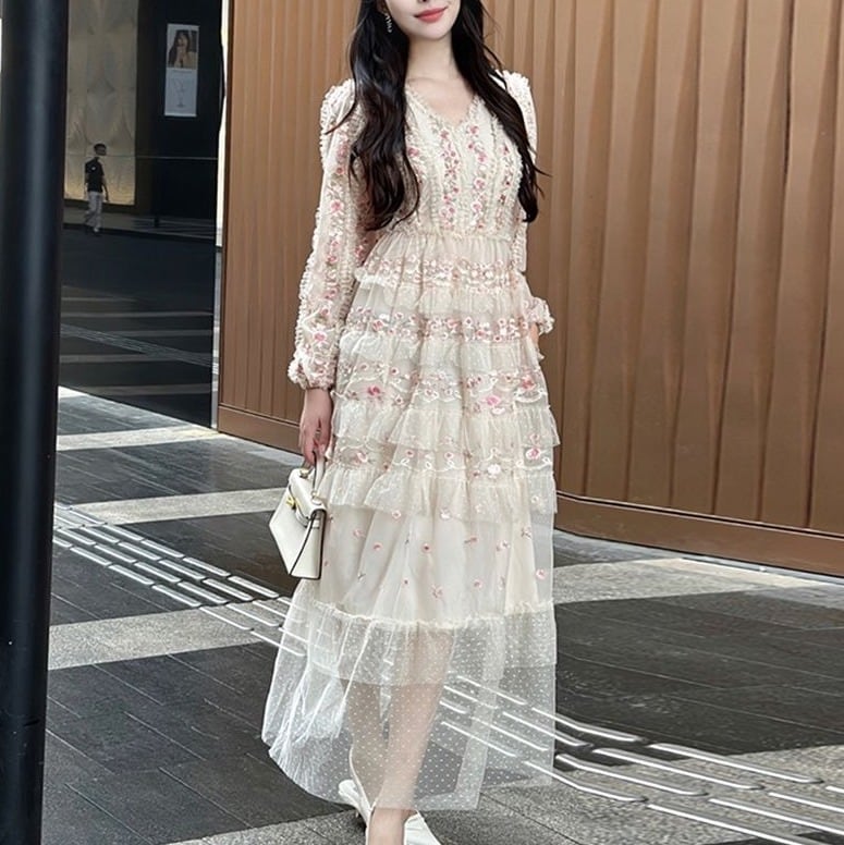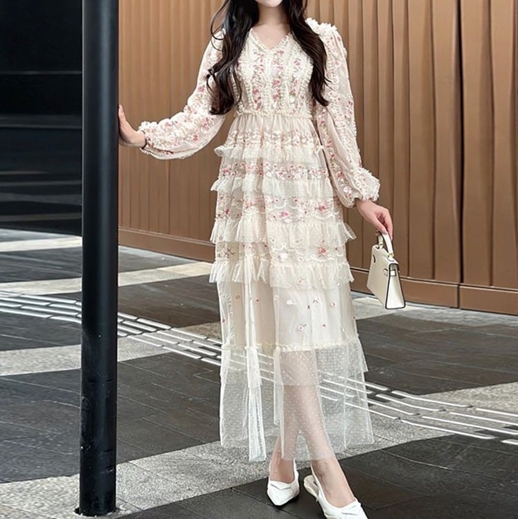 送料無料 ◆ D2235 フラワー 刺繍 ティアード ラッフルフリル バルーンスリーブ ロング ワンピース 《 オフホワイト×ピンク 》 長袖 オフホワイト アイボリー ベージュ 裏地あり インポートワンピース パーティードレス メール便 フリル パーティー 結婚式 お呼ばれ シアーワンピース 長袖 ワンピース 同窓会 謝恩会 ドレス 膝丈 マキシ ロング 発表会 卒業パーティー 刺繍ドレス クリスマス レースワンピース 柄ワンピース
