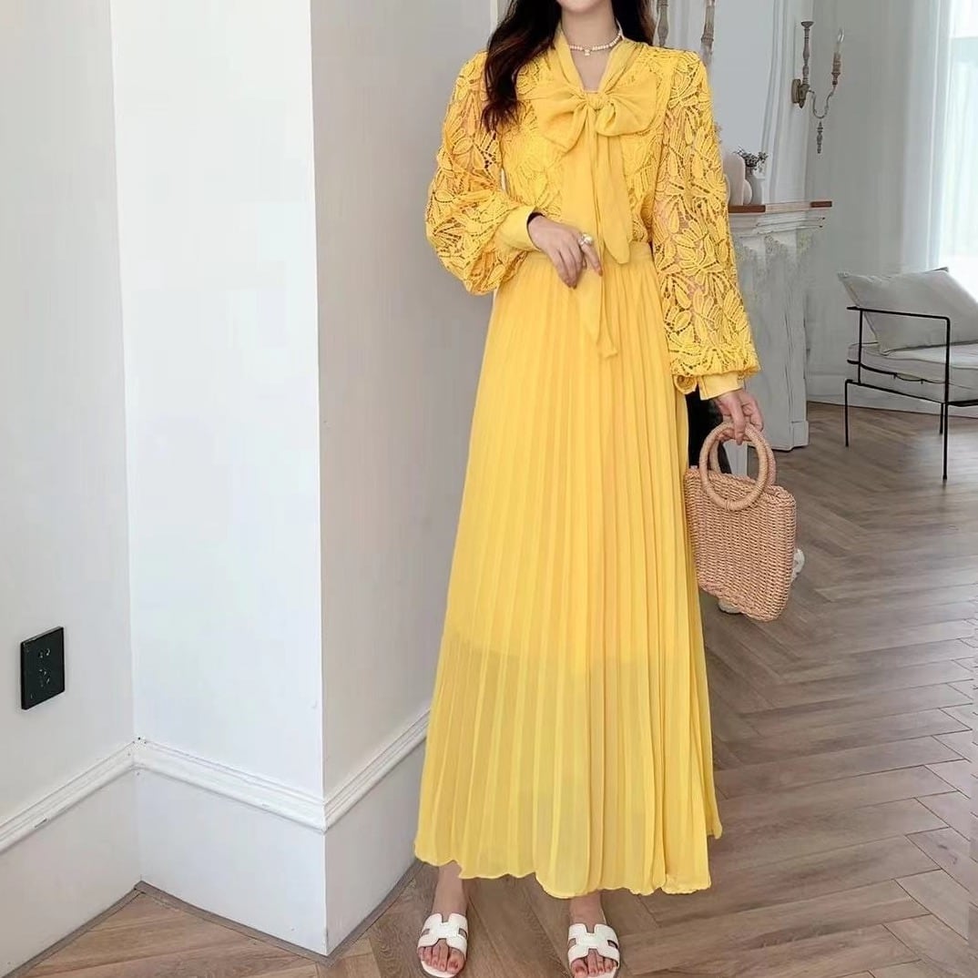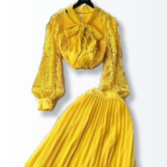 送料無料 ◆ D2244 ボウタイ クロッシェレース 長袖 前開き ドレスシャツ ブラウス & プリーツ ロングスカート セットアップ《 イエロー 》2点セット 上下セット ツーピース 2ピース 長袖 ブラウス シャツ 袖あり 青セットアップ トップス プリーツスカート クラシカル スーツ パーティードレス メール便 パーティーワンピ カジュアル 膝下 袖あり おしゃれ インポートワンピース お呼ばれ ミモレ お出かけ 上品 衣装 同窓会 謝恩会 お食事 オフィスカジュアル