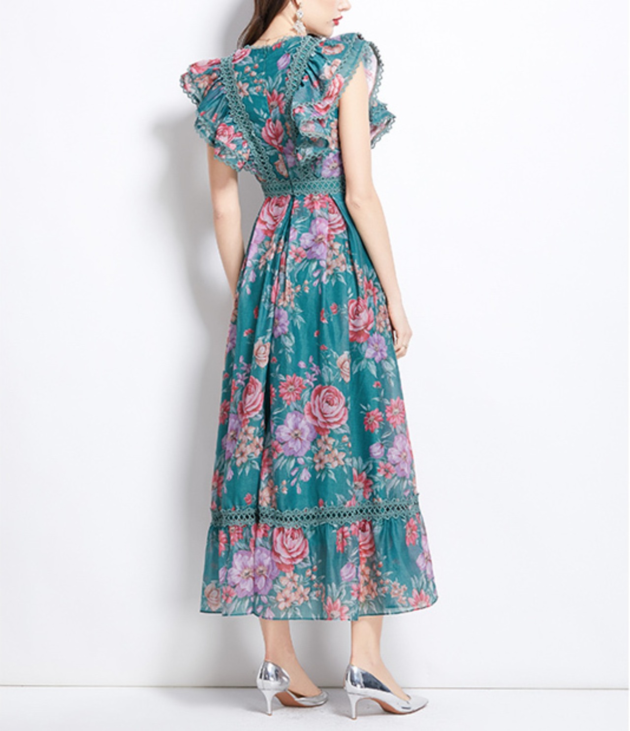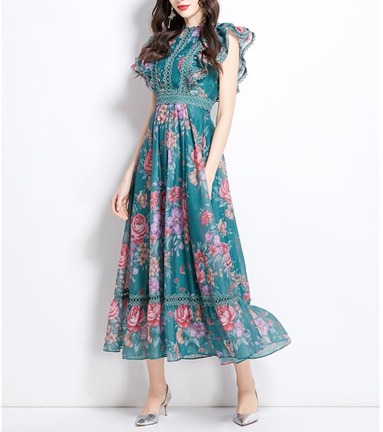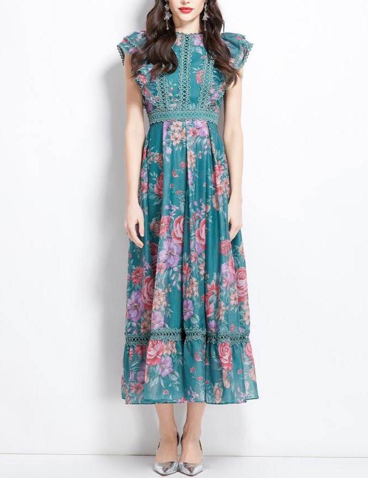 送料無料 ◆ D2281 フリルスリーブ ローズ クロッシェレース ロング ドレス ワンピース《 グリーン 》緑ワンピース 半袖 グリーンドレス ラッフルフリル フリルスリーブ 半袖 マキシワンピース マキシ丈 青ワンピース お出かけ 清楚 上品 インポートワンピース パーティードレス 衣装 メール便