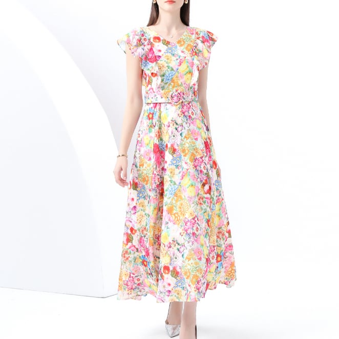 送料無料 ◆ D2265 ベルト付き フラワー ラッフルスリーブ ロング ドレス ワンピース《 マルチカラー 》 カラフル 華やか カラフル パステル マキシワンピース ドレス ピンクワンピース 半袖 シフォン リボン ラッフルスリーブ フレア プリーツ ベルト 膝下 ミモレ ロング 袖あり パーティードレス 衣装 同窓会 謝恩会 発表会 インポートワンピース