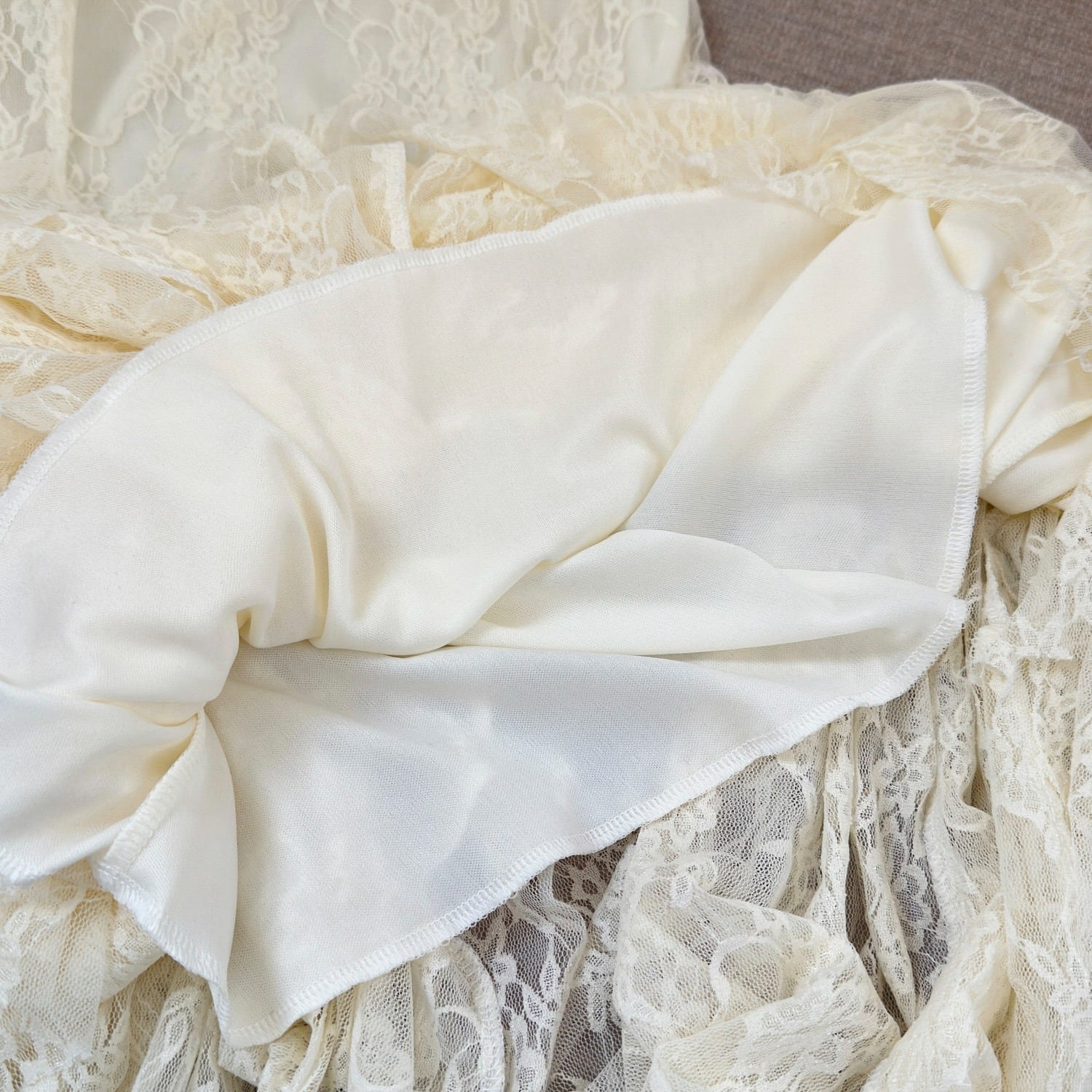 レース生地に胸元から裾までオフホワイトの裏地付き