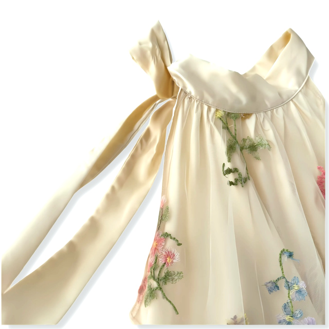 前後チュール生地にパステルカラーの花と蝶々刺繍