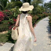 送料無料 ◆ D1985-2 ネックリボン 刺繍 ボタニカル ノースリーブ ロング ドレス ワンピース《 オフホワイト 》 総刺繍 アメリカンスリーブ ノースリーブドレス マキシワンピース ロング お出かけ 清楚 上品 インポートワンピース パーティードレス 衣装 メール便 エレガント サマードレス レイヤード 重ね着風 ノースリワンピ