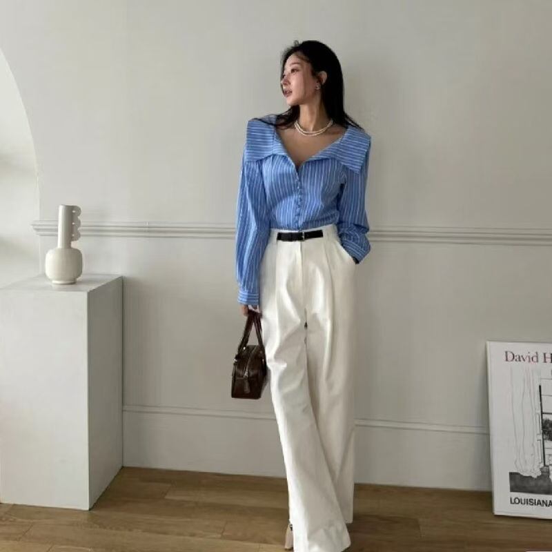 《訳ありアウトレット》送料無料 ◆ D2251 オープンカラー ストライプ 胡桃ボタン 前開き ドレスシャツ ブラウス 《 ライトブルー×ホワイト 》襟付き 水色 ホワイト クラシカルシャツシャツ ブラウス ブラウン リボンタイ 柄シャツ 柄ブラウス クラシカル ブラウス トップス メール便 柄 ストライプ デザインシャツ ヴィンテージ風 レトロ シャツ 柄物 インポートシャツ インポートブラウス 衣装 オフィスカジュアル 柄トップス 訳あり わけあり ワケあり B品 SALE セール