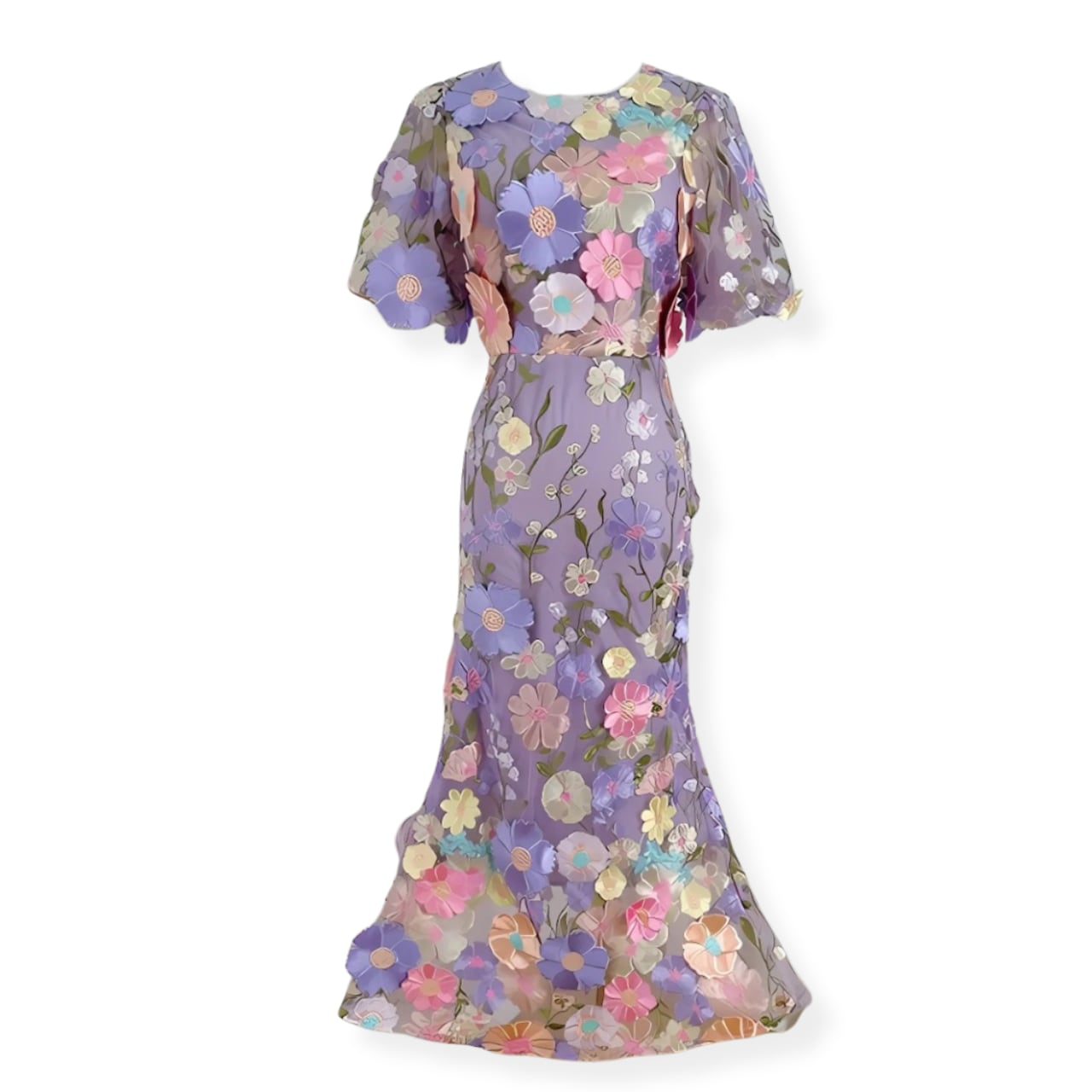 送料無料 ◆ D2339 刺繍 立体 フラワー レース パフスリーブ ロング マーメイド ドレス ワンピース《 ラベンダー 》花柄 花刺繍 総刺繍 チュール フラワーモチーフ 無地 袖あり ハーフスリーブ レース お出かけ 膝下 お呼ばれ 結婚式 パーティードレス メール便 同窓会 発表会 ラウンドネック 謝恩会 ホワイトドレス 白ドレス オケージョン オケージョンドレス インポート 結婚式 花嫁 ウェディング