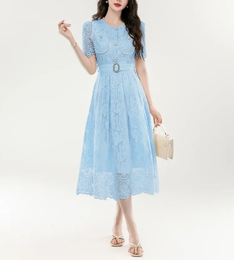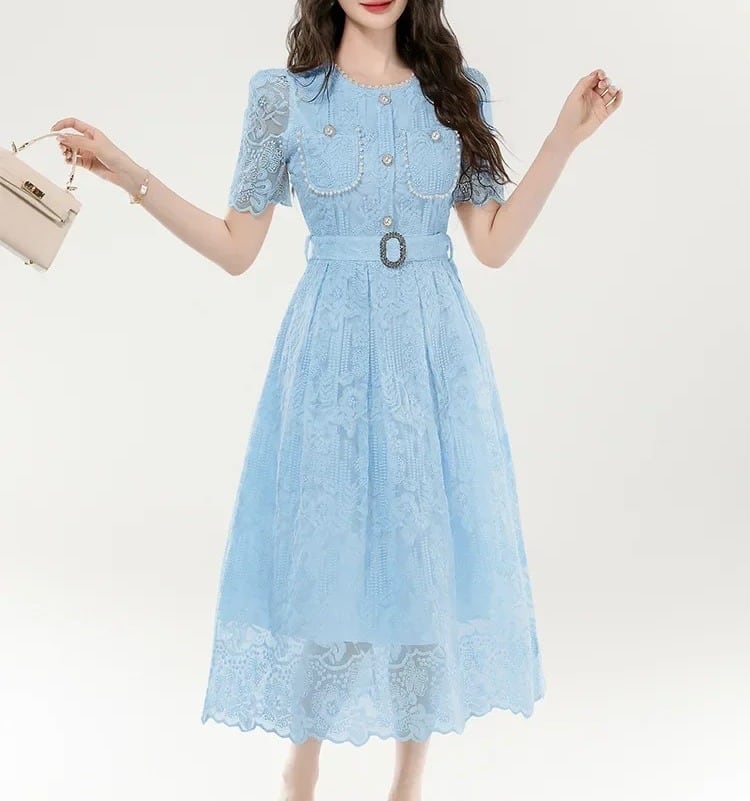 送料無料 ◆ D2345 ベルト付き 刺繍レース パールボタン ロング ドレス ワンピース《 ライトブルー 》 フレアワンピース ワンピース 青ドレス 無地 膝丈 ひざ下 インポートワンピース パーティードレス メール便 パーティーワンピ 袖付き お呼ばれワンピース ドレス 衣装 膝下 ドレス ワンピ ドレス インポートワンピース お呼ばれ デート 上品 衣装 エレガント お出かけ 発表会 同窓会 謝恩会