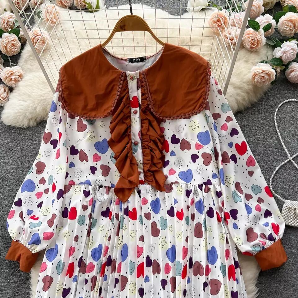 《訳ありアウトレット》送料無料 ◆ D1395 ブラウン フリル ビックカラー ハート プリーツ ロング ワンピース 《 ブラウン × マルチカラー》長袖 ブラウン襟 襟付き パールボタン 茶色 カラフル ハート柄 柄物ワンピース 柄ワンピ 柄物 プリーツ フレアワンピース 結婚式 パーティードレス 膝丈 パーティー フリル ロング パーティーコーデ カジュアル 華やか フリフリ フリルスリーブ 2次会 衣装 カジュアルワンピース 訳あり わけあり ワケあり B品 SALE セール
