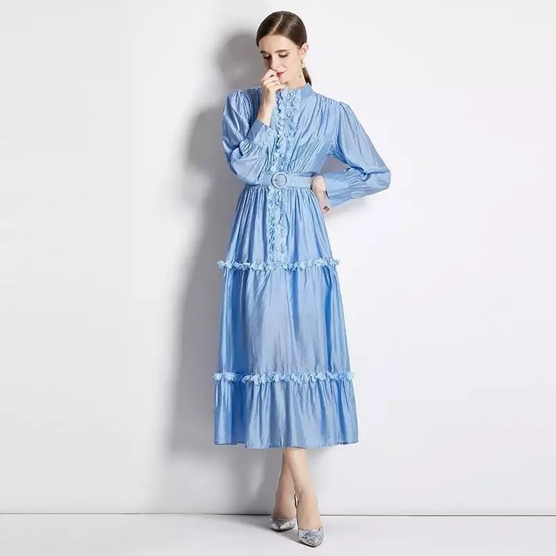 《訳ありアウトレット》送料無料 ◆ D1326 ベルト付き フラワー 立体モチーフ 胡桃ボタン バルーンスリーブ ティアード ロング ワンピース 《ライトブルー》水色 フレア マキシ丈 膝丈 フリル エレガント レディ ロングワンピース フレア 無地 ワンピース レース 膝丈 ロング シャツワンピース インポートワンピース お呼ばれ パーティードレス メール便 パーティーワンピ 袖付き お呼ばれワンピース ひざ丈 長袖 インポートワンピース お呼ばれ 上品 訳ありアウトレット わけあり 訳あり