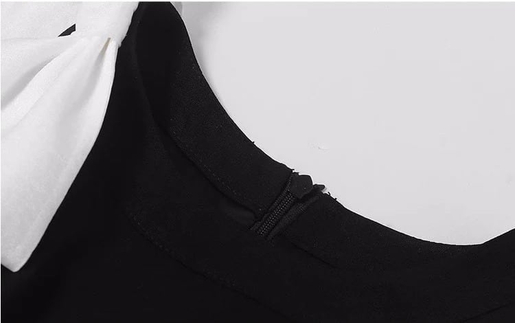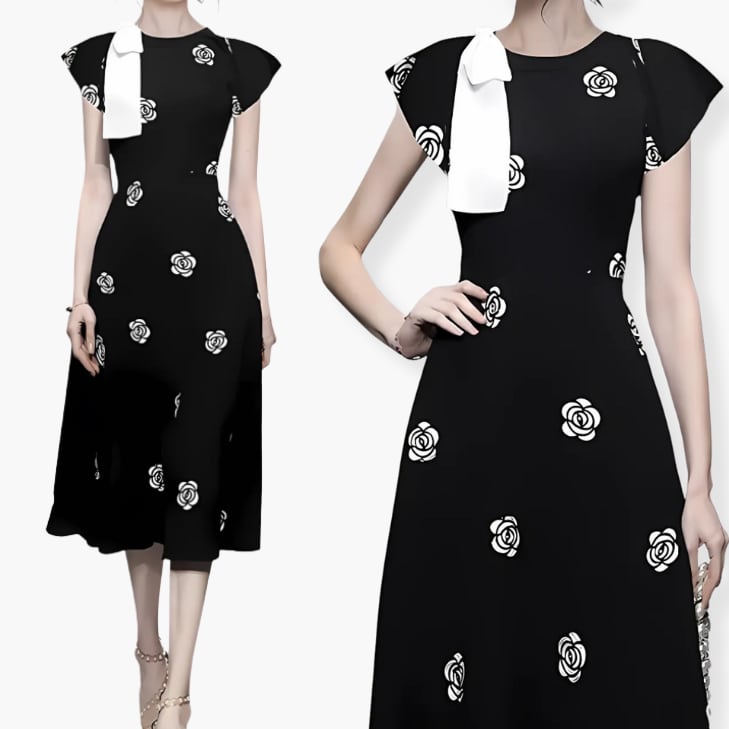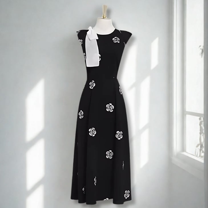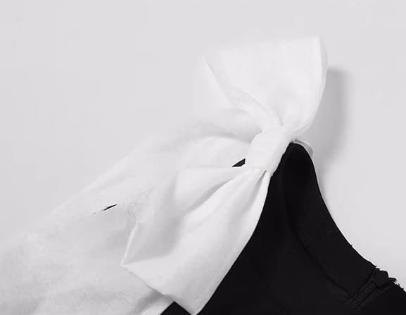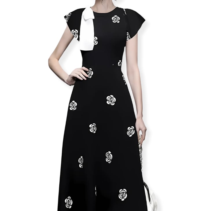送料無料 ◆ D2375 ホワイト ショルダーリボン カメリア 刺繍 フレンチスリーブ ワンピース 《ブラック×ホワイト》 白黒 花柄 ブラック フォーマル 華やか ワンピース 膝下 ミモレ マキシ ロング 柄物 ウエディング メール便 エレガント パーティー お出かけ 上品 衣装 パーティードレス 発表会 結婚式 カジュアル セミフォーマル 白黒 ドレス オフィスカジュアル