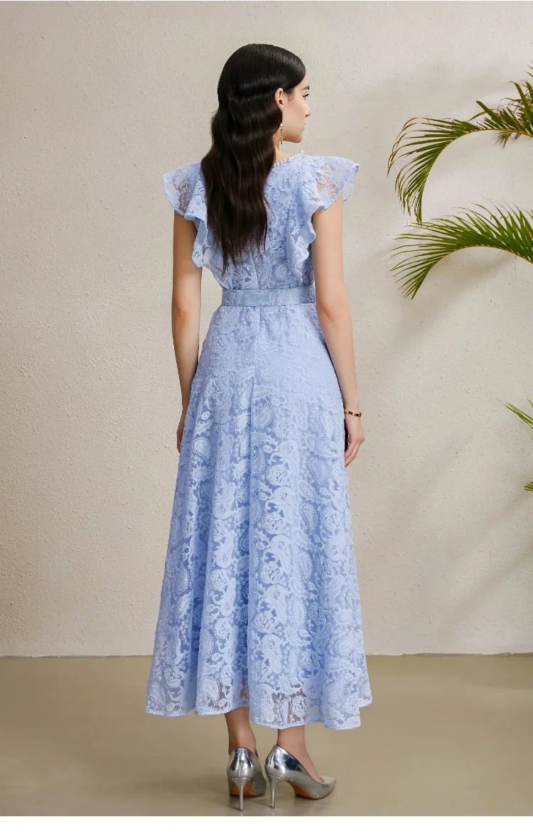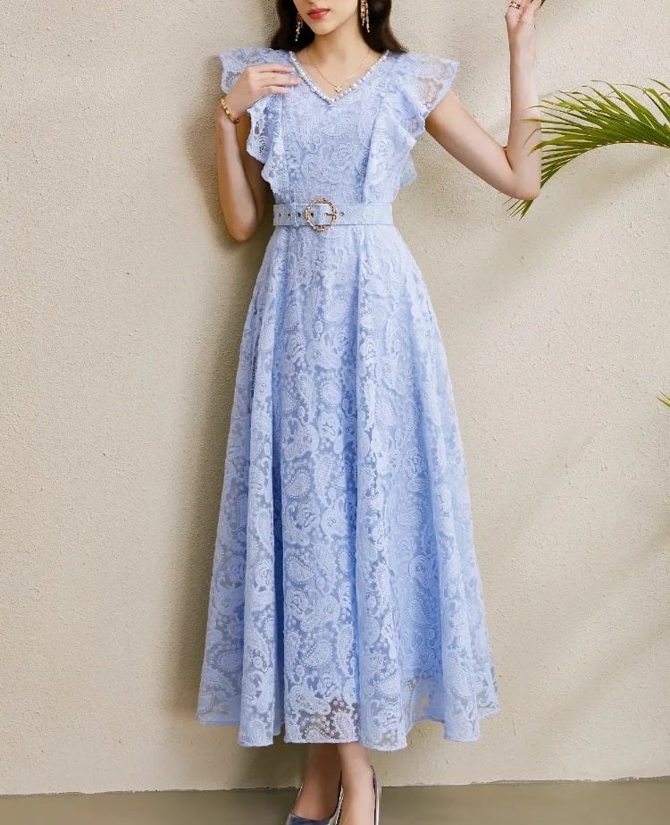 送料無料 ◆ D2377 ベルト付き 刺繍 レース パール Vネック フリルスリーブ ロング ドレス ワンピース《 ライトブルー 》 フレアワンピース ワンピース 青ドレス 無地 膝丈 ひざ下 インポートワンピース パーティードレス メール便 パーティーワンピ 袖付き お呼ばれワンピース ドレス 衣装 膝下 ドレス ワンピ ドレス インポートワンピース お呼ばれ デート 上品 衣装 エレガント お出かけ 発表会 同窓会 謝恩会