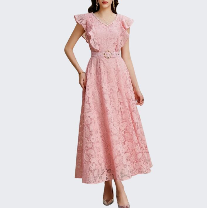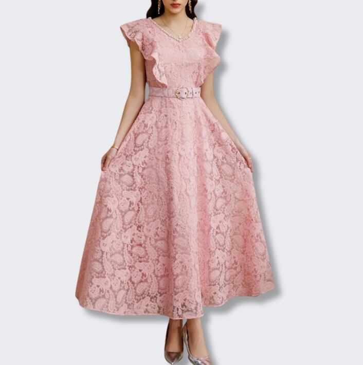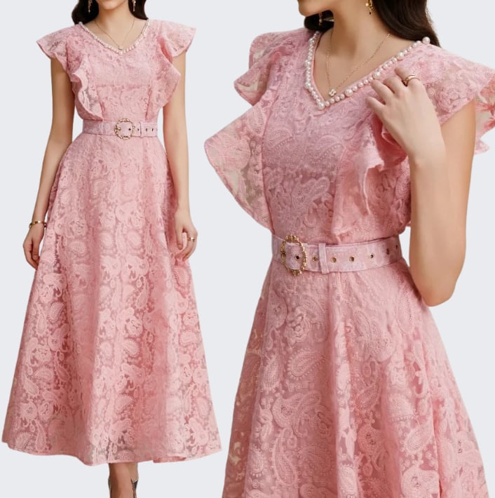 送料無料 ◆ D2378 ベルト付き 刺繍 レース パール Vネック フリルスリーブ ロング ドレス ワンピース《 ライトブルー 》 フレアワンピース ワンピース 青ドレス 無地 膝丈 ひざ下 インポートワンピース パーティードレス メール便 パーティーワンピ 袖付き お呼ばれワンピース ドレス 衣装 膝下 ドレス ワンピ ドレス インポートワンピース お呼ばれ デート 上品 衣装 エレガント お出かけ 発表会 同窓会 謝恩会