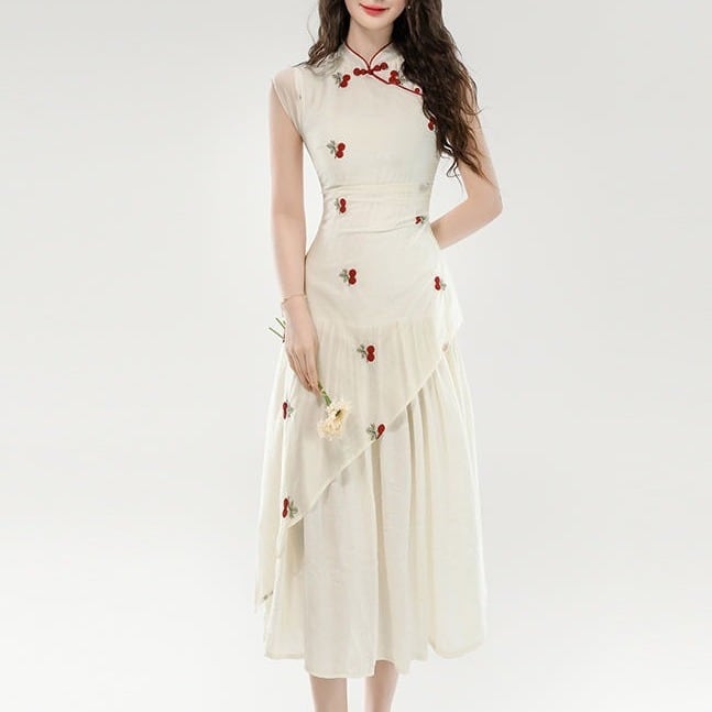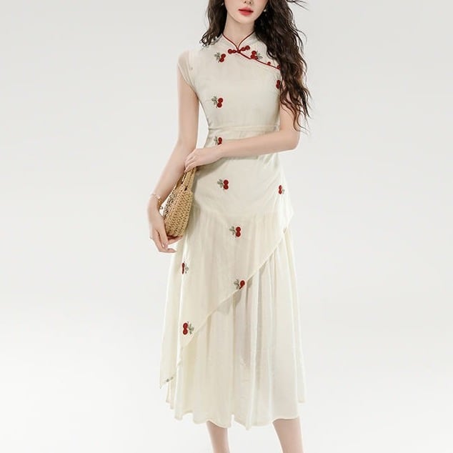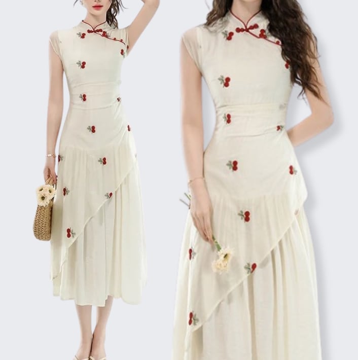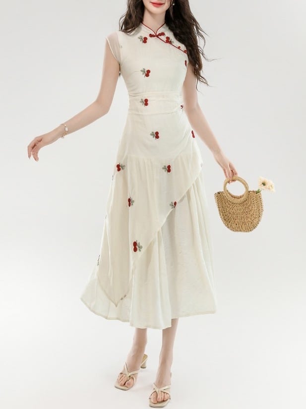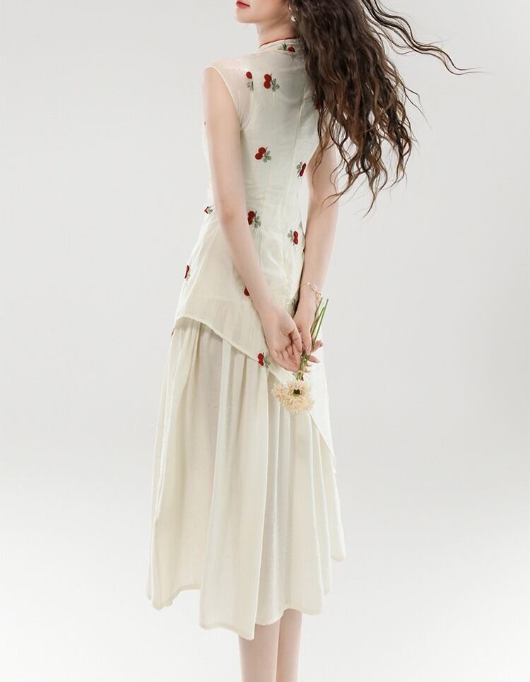 送料無料 ◆ D2379 チェリー 刺繍 レイヤード チャイナ ドレス ワンピース《 オフホワイト×レッド 》チェリー さくらんぼ 刺繍 アイボリー チャイナワンピース チャイナドレス 膝丈 膝下 ミディ丈 パーティーワンピ お呼ばれワンピース お食事 ひざ丈 お呼ばれ 結婚式 お呼ばれ おしゃれ 袖あり インポートワンピースオケージョン オケージョンドレス パーティードレス 発表会 衣装 ミディワンピース