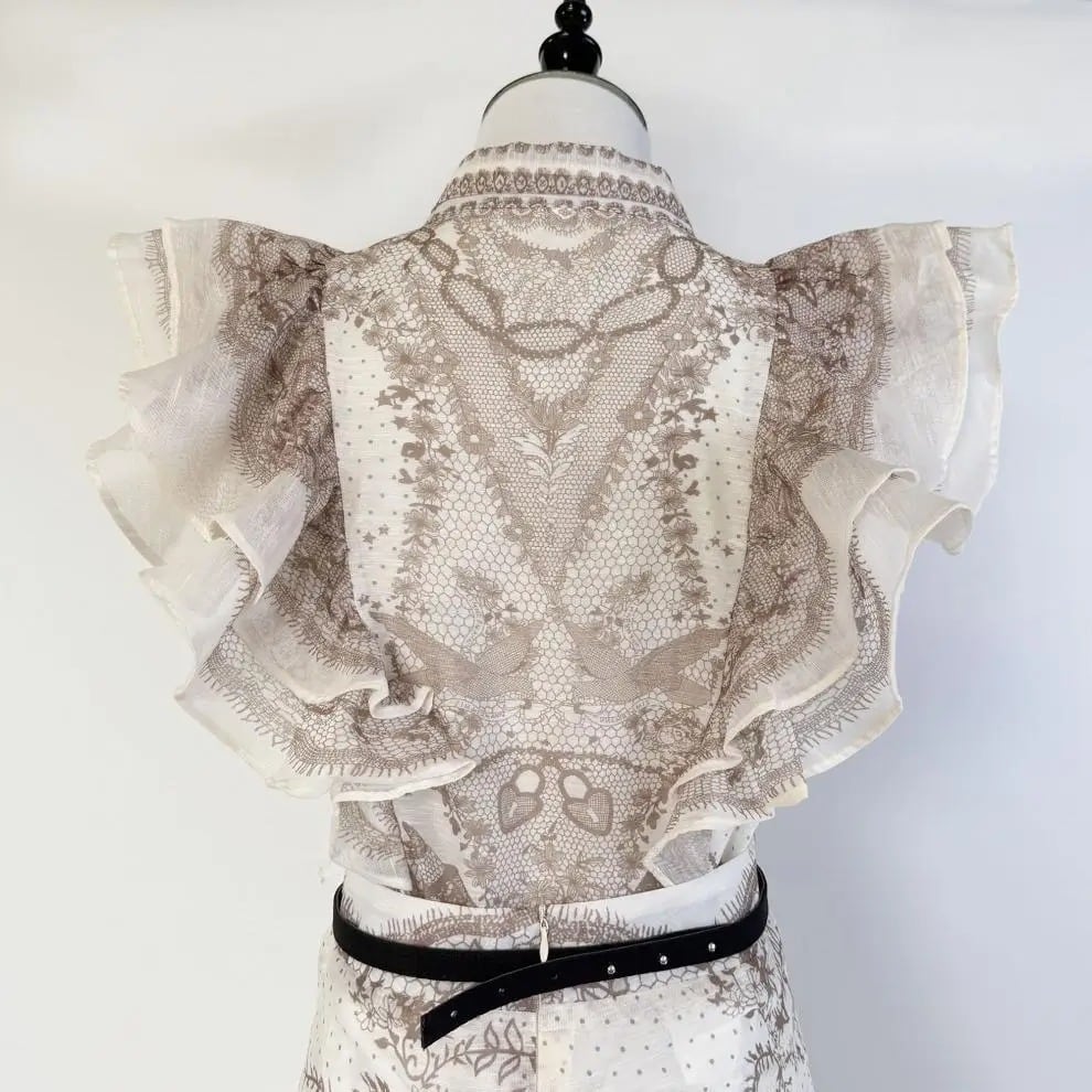 ブラウスはシルバーのビジューボタンで首元からウエストまで開閉します