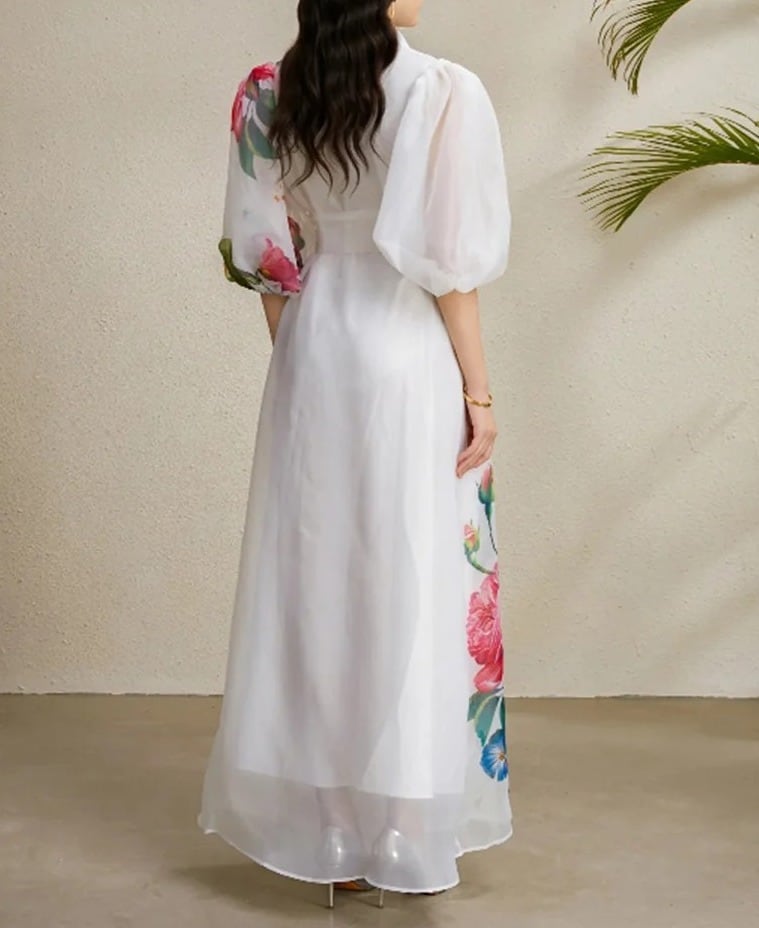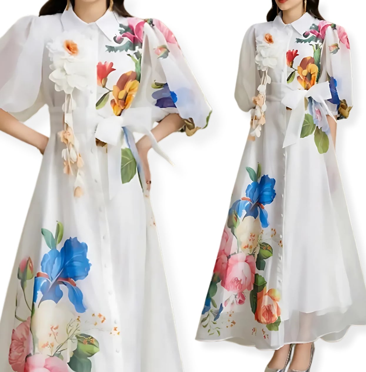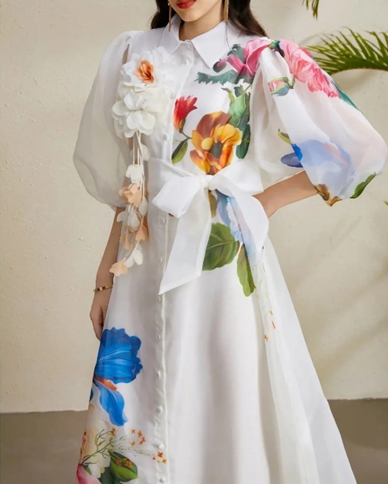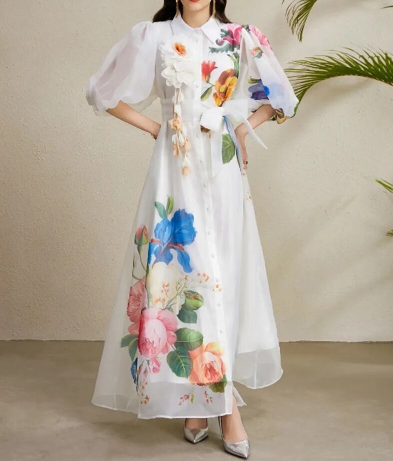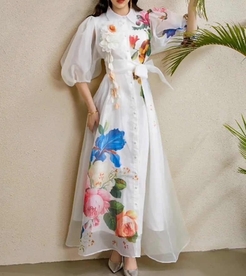 送料無料 ◆ D2396 フラワーブローチ & リボン付き 胡桃ボタン 前開き バルーンスリーブ フラワー ロング ワンピース《 ホワイト 》 シャツワンピース ホワイト 白ワンピ 袖あり シアー 半袖 ロング 大柄 インポートワンピース メール便 裏地あり 上品 エレガント ひざ丈 パーティー ワンピ インポートドレス 衣装 オケージョンドレス 同窓会 謝恩会 発表会