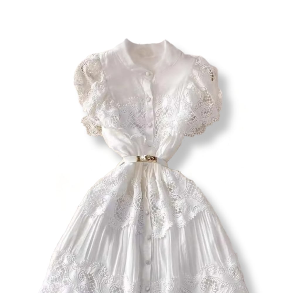 送料無料 ◆D2401 ホワイトベルト付き 胡桃ボタン 前開き クロッシェレース ロング ワンピース《 ホワイト》ホワイトワンピース 白ワンピース 切替ワンピース 膝丈 ドッキング 切替 ミモレ丈 半袖 インポート パーティードレス お出かけ パーティーワンピ 結婚式 2次会 パーティー お呼ばれワンピース お食事 ひざ丈 おしゃれ 袖あり インポートワンピース