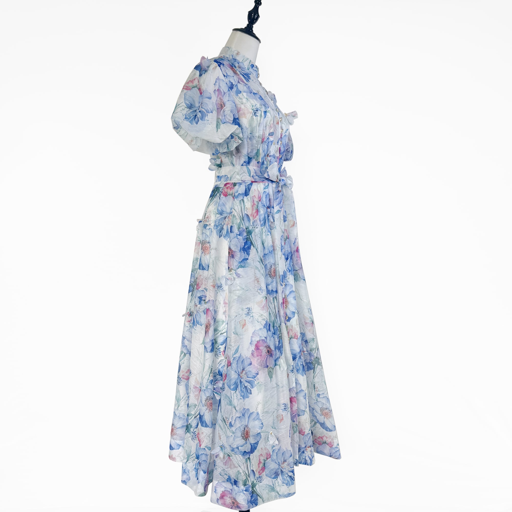 送料無料 ◆ D2404 ペチコート &リボン付き カメリアボタン 花柄 フラワー 装飾 前開き パフスリーブ ロング ワンピース《 ホワイト×ブルー 》カラフル クラシカルボタン ゴールドボタン 花柄 クラシカルボタン ボタン 袖あり クラシック 柄物ワンピース 柄ワンピース 柄物 レトロ ヴィンテージ風 ワンピース クラシックワンピース ドレスワンピース 袖あり ミモレ 膝下 膝下丈 ワンピース お呼ばれ おしゃれ 衣装 おでかけ エレガント ベルトセット 上品 カジュアル メール便