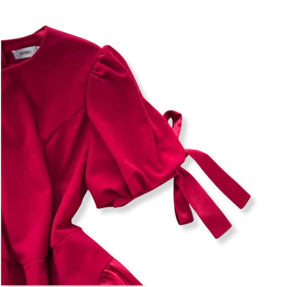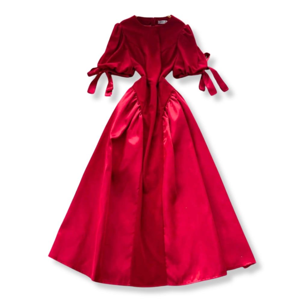 送料無料 ◆ D2407 パフスリーブ サテンリボン クラシカル フレア ロング ワンピース《 レッド 》 赤 異素材ミックス 切替 赤色ワンピース 赤ドレス 無地 インポートワンピース パーティードレス パーティーワンピ お食事 ひざ丈 半袖 ティアード おしゃれ 袖あり 衣装 エレガント クラシック オケージョンドレス カジュアル
