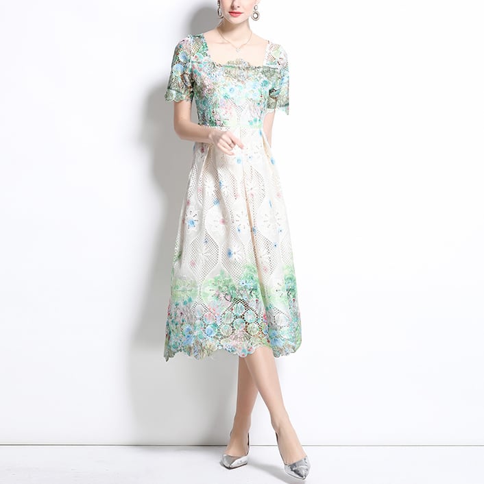 《訳ありアウトレット》送料無料 ◆ D2272 フラワークロッシェレース スクエアネック ハーフスリーブ ロング ドレス ワンピース《 ホワイト×パステルグリーン 》フレアワンピース ワンピーン ライムグリーン ドレス 無地 膝丈 ひざ下 インポートワンピース パーティードレス メール便 パーティーワンピ 袖付き お呼ばれワンピース ドレス 衣装 膝下 ワンピ ドレス インポートワンピース お呼ばれ デート 上品 衣装 エレガント 謝恩会 訳ありアウトレット わけあり 訳あり