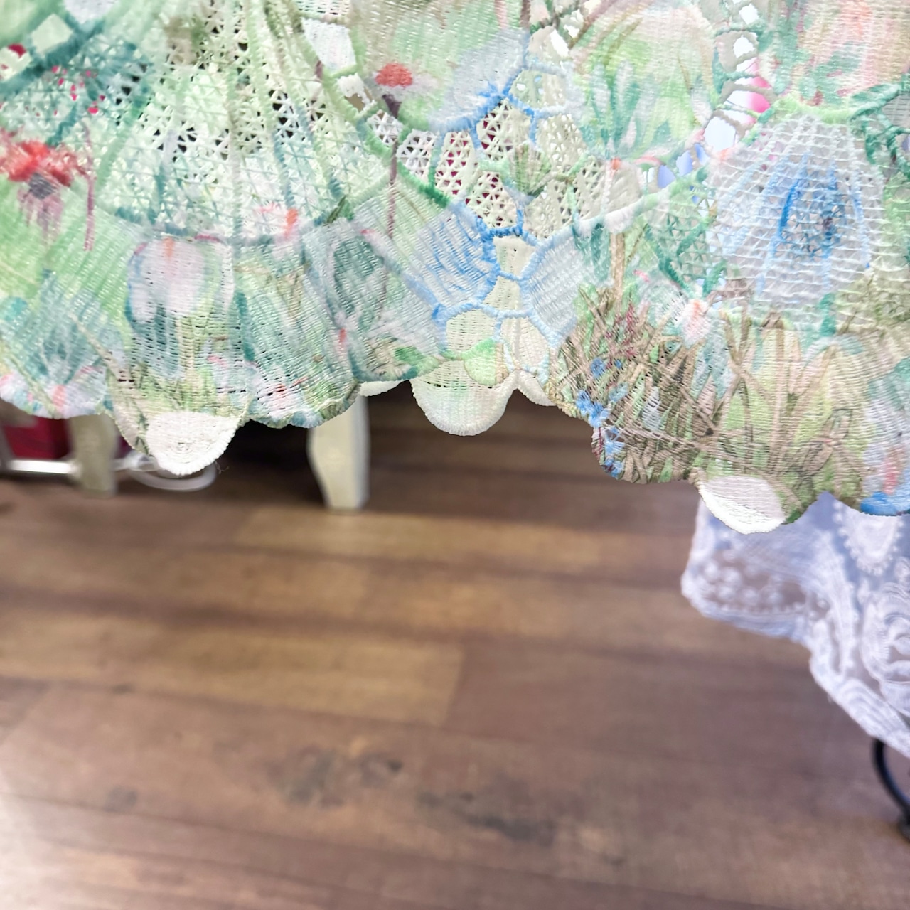 ホワイトレースにパステルカラーのグリーンやピンク、ライトブルーなどの花柄