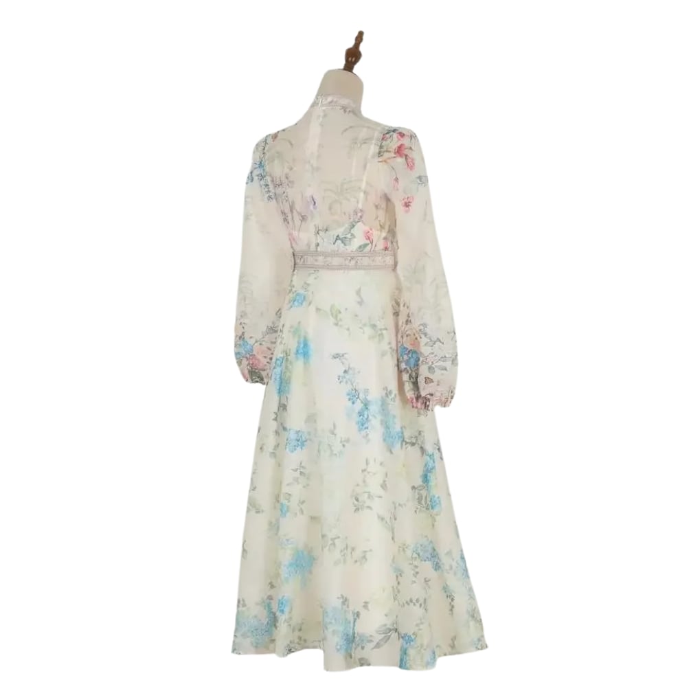 送料無料 ◆ D2412 ベルト & ペチコート 付き マルチボタン ボタニカルフラワー 前開き バルーンスリーブ ロング ワンピース《 ホフホワイト×マルチ 》カラフル ボタン色々 色々ボタン 花柄 クラシカルボタン ボタン 袖あり クラシック 柄物ワンピース 柄ワンピース 柄物 レトロ ヴィンテージ風 ワンピース クラシックワンピース ドレスワンピース 袖あり ミモレ 膝下 膝下丈 ワンピース 衣装 エレガント カジュアル
