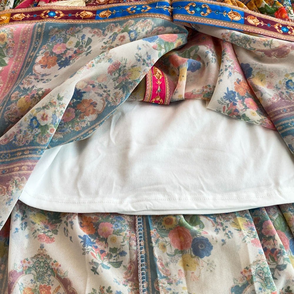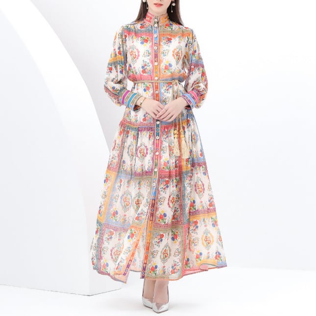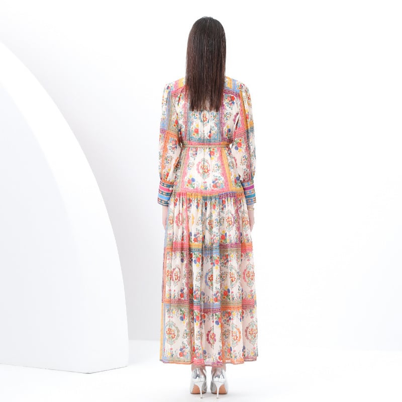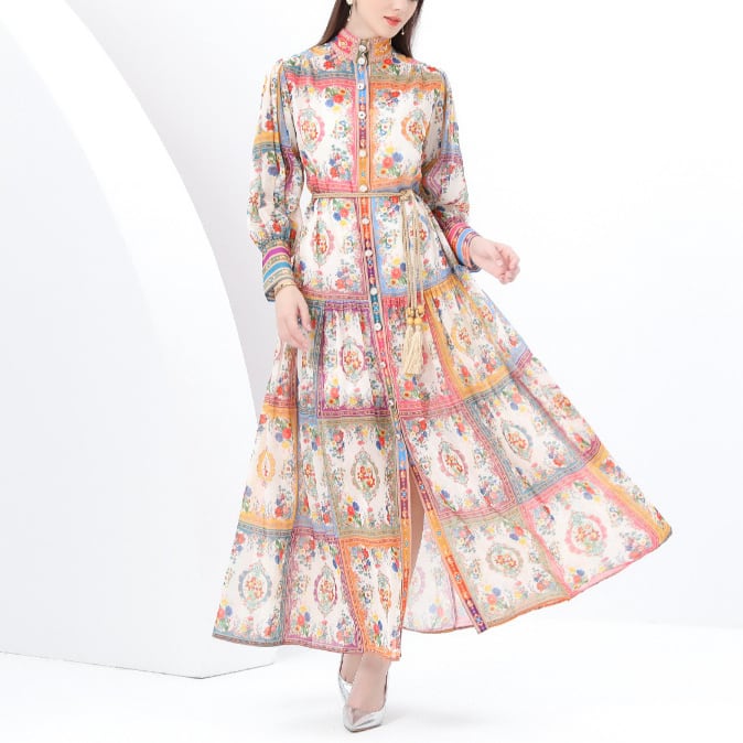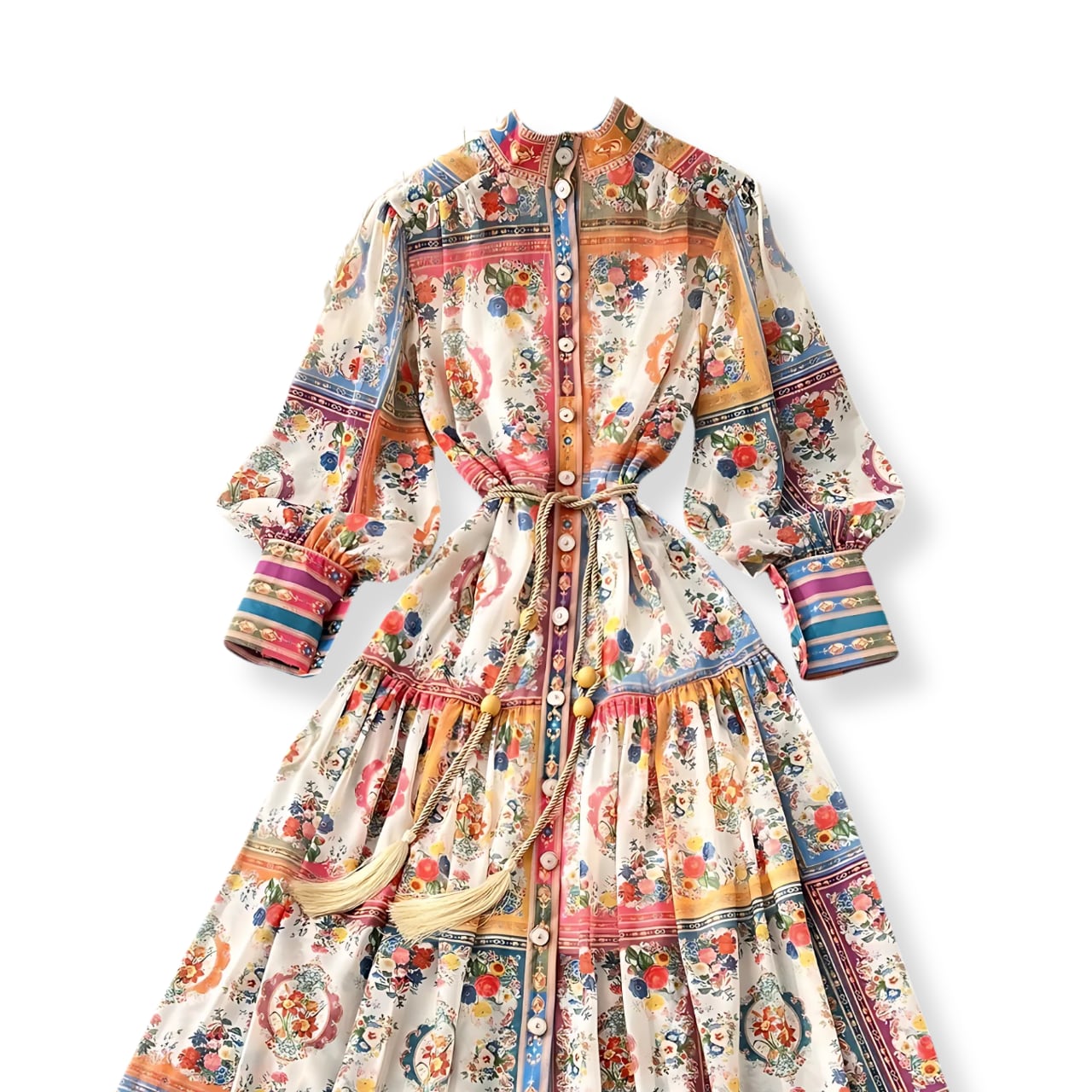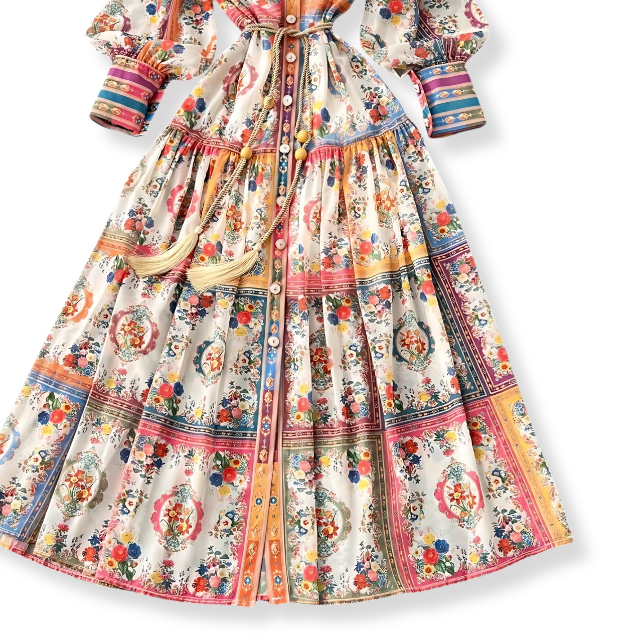 送料無料 ◆ D2428 ゴールドロープベルト & ペチコート付き ウッドビーズ 前開き パッチワークフラワー バルーンスリーブ ロング ワンピース《ホワイト × マルチカラー》ブーケ 花柄 プリント ベルトセット 柄物ワンピース 柄ワンピース ヨーロピアン ワンピース 柄物 上品 華やか お出かけ パーティードレス 発表会 女子会 お食事会 ドレスワンピース お出かけ お呼ばれ リゾート バカンス 旅行 お洒落 華やか ヴィンテージ風 ベルト付きワンピ 衣装 クラシカル クラシックワンピース