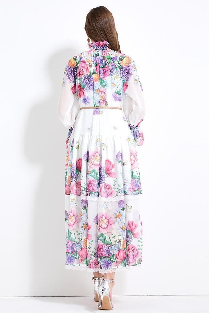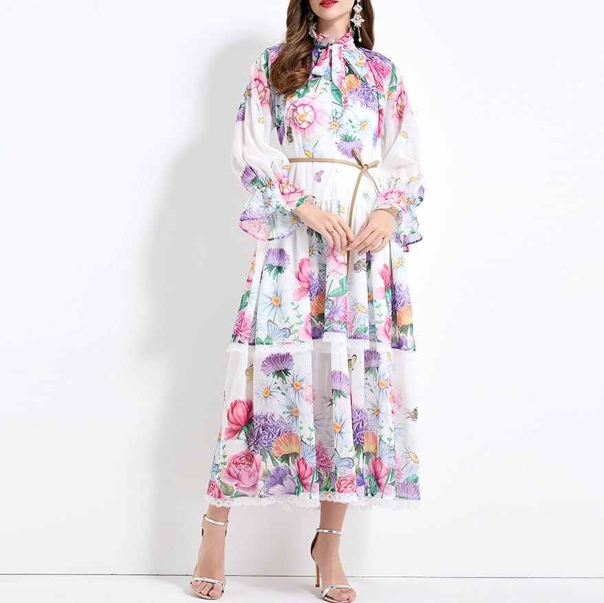 送料無料 ◆ D2430 キャメルベルト & ペチコート付き ボウタイ 花柄 バルーンスリーブ ティアード ロング ワンピース《 ホワイト×パープル 》フラワー 花柄 パステル 柄物 カラフル インポートワンピース パーティードレス メール便 パーティーワンピ お食事 ひざ丈 長袖 おしゃれ 袖あり 衣装 エレガント 同窓会 卒業パーティー 謝恩会