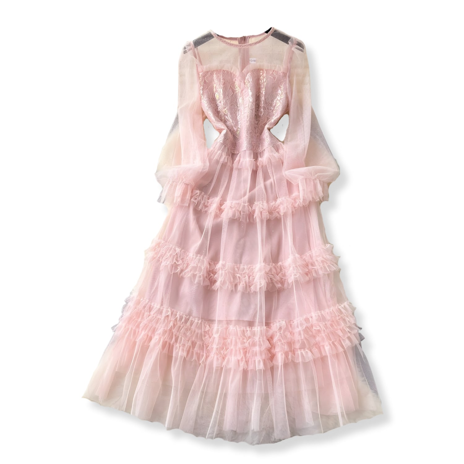 送料無料 ◆ D2434 ゴールドドット レース バルーンスリーブ ティアード チュール フレア ロング ワンピース《ピンク》インポート パーティードレス パープル ピンク ワンピース メール便 パーティーワンピ ペチコート お食事 おしゃれ 袖あり インポートワンピース パーティードレス 膝下 膝丈 ロングワンピース 衣装 エレガント 華やか 発表会 同窓会 謝恩会 お呼ばれドレス ピンクドレス