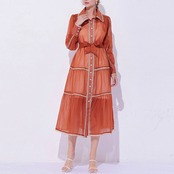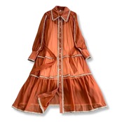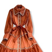 送料無料 ◆ D2445 ペチコート & リボン付き ゴールドレース ビジューボタン 長袖 前開き ロング ワンピース《 ブラウン×ゴールド 》 襟付き シャツワンピース パーティーコーデ 膝丈 インポート パーティー メール便 パーティースカート パーティーコーデ お食事 ひざ丈 おしゃれ 無地 パーティー お出かけ カジュアル ビジュー インポートスカート 衣装 フレア モード
