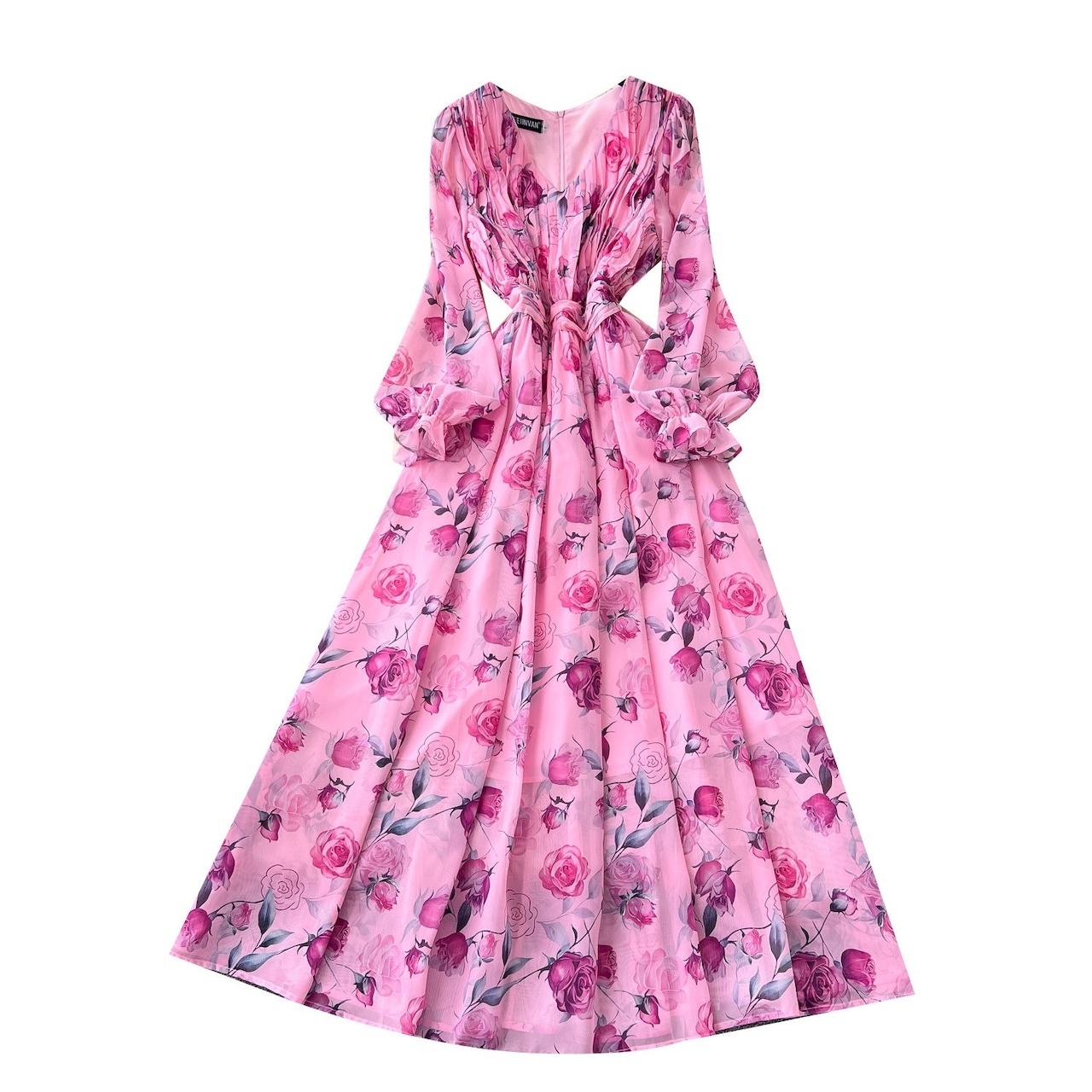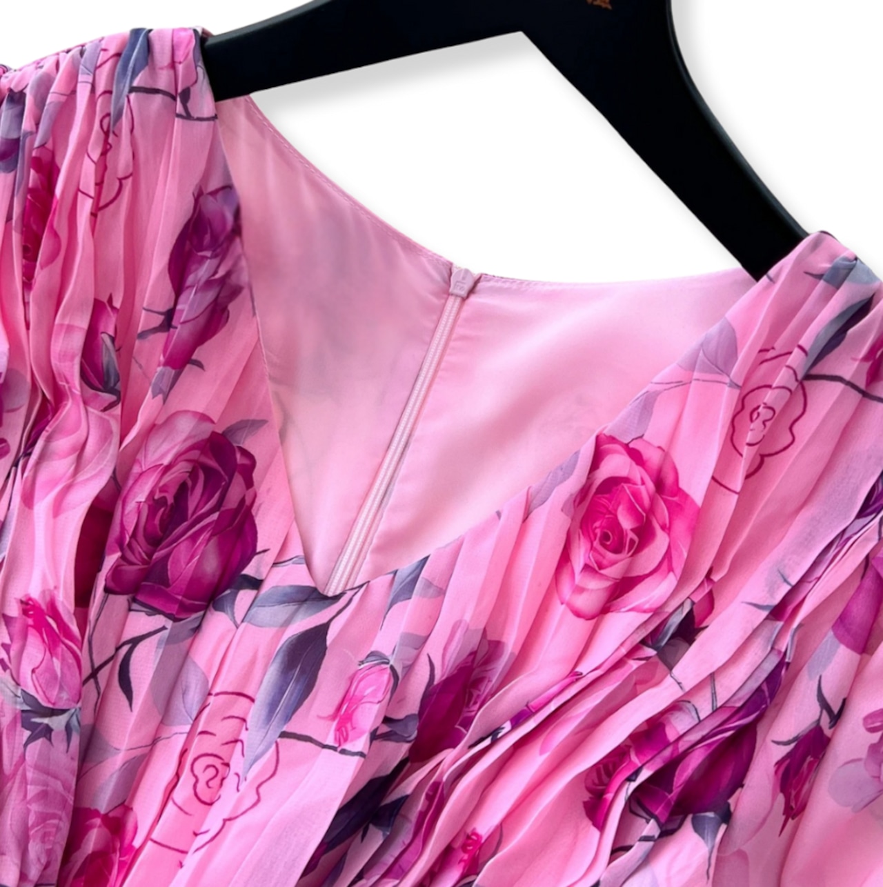 送料無料 ◆ D2450 ローズ柄 Vネック バルーンスリーブ ロング ドレス ワンピース《 ローズピンク 》ローズ フラワー ポケット 絵画 水色 ライトブルー ブルー 青 ロングスリーブ ワンピース マキシ丈 白ワンピース お出かけ 清楚 上品 インポートワンピース パーティードレス 衣装 柄ワンピース 柄物 パーティー 華やか エレガント メール便
