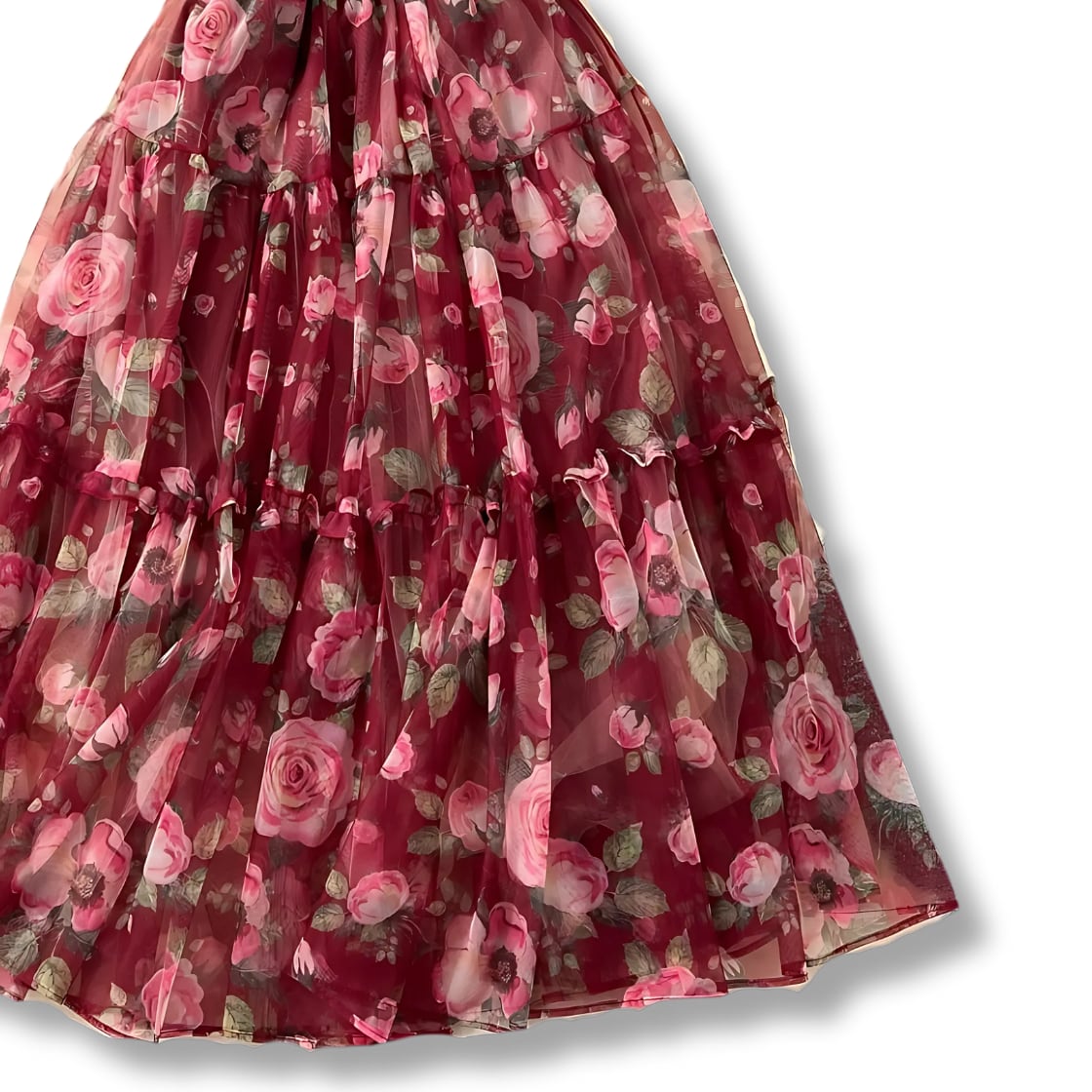 ウエストから下はボルドーの裏地+ベージュチュール+ローズ柄生地の3枚重ね