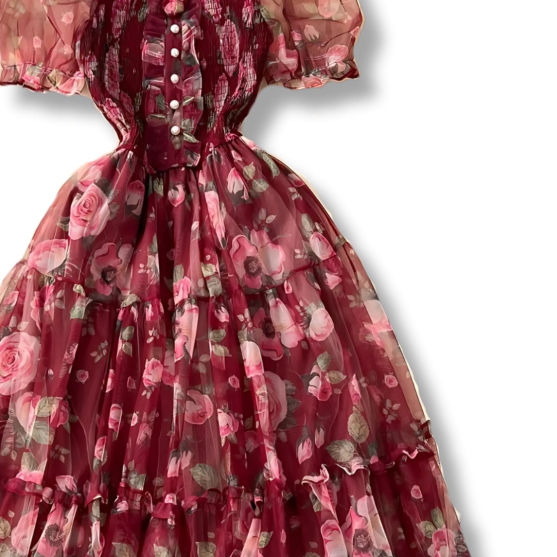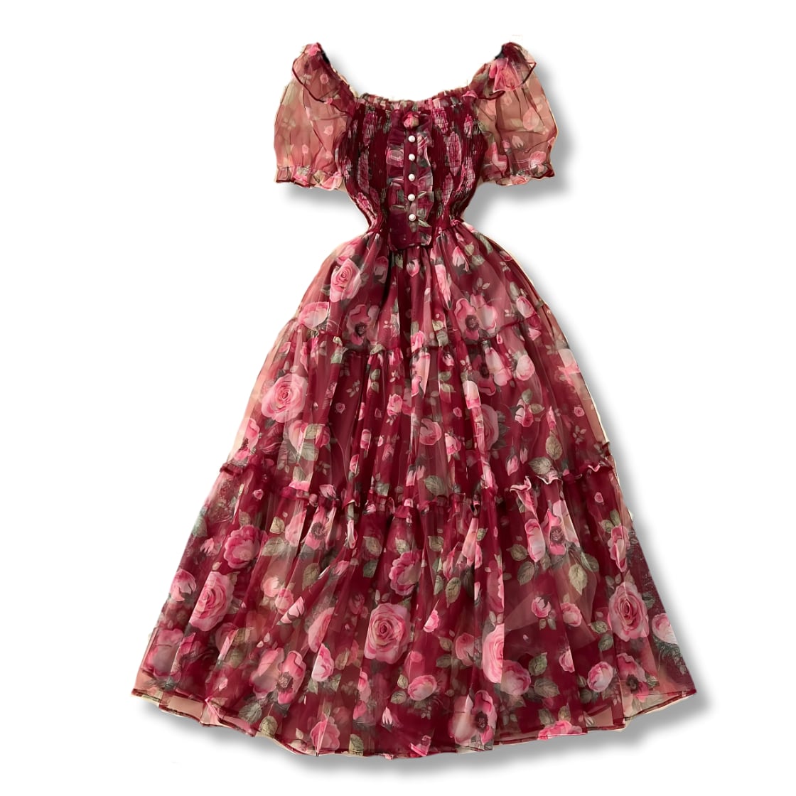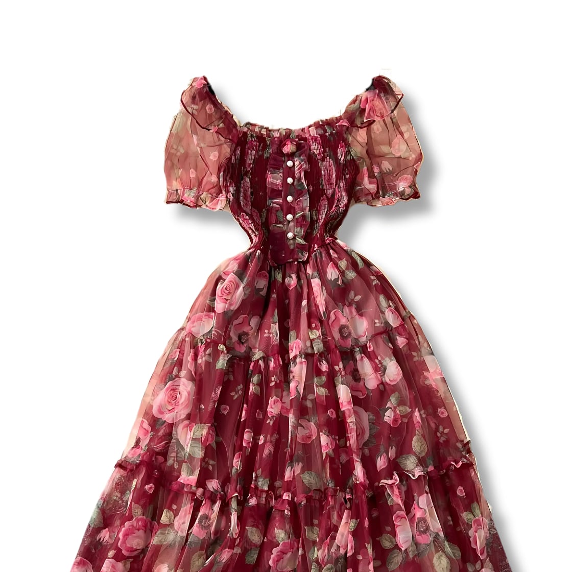 送料無料 ◆ D2461 ローズ柄 2way オフショルダー パールボタン クラシカル ロング ドレス ワンピース《 ボルドー 》レッド 赤 バラ柄 ロングスリーブ ワンピース ロング フレア お出かけ 清楚 上品 インポートワンピース パーティードレス 衣装 柄ワンピース 柄物 パーティー 華やか エレガント メール便
