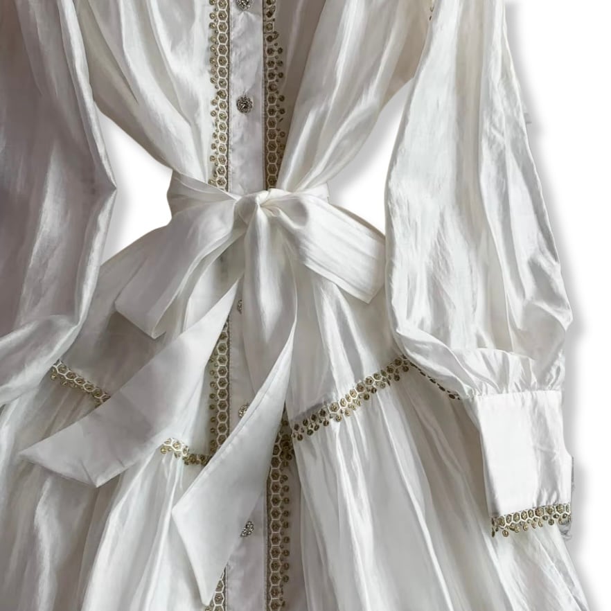 送料無料 ◆ D2463 ペチコート & リボン付き ゴールドレース ビジューボタン 長袖 前開き ロング ワンピース《 ホワイト×ゴールド 》 襟付き シャツワンピース パーティーコーデ 膝丈 インポート パーティー メール便 パーティースカート パーティーコーデ お食事 ひざ丈 おしゃれ 無地 パーティー お出かけ カジュアル ビジュー インポートスカート 衣装 フレア モード