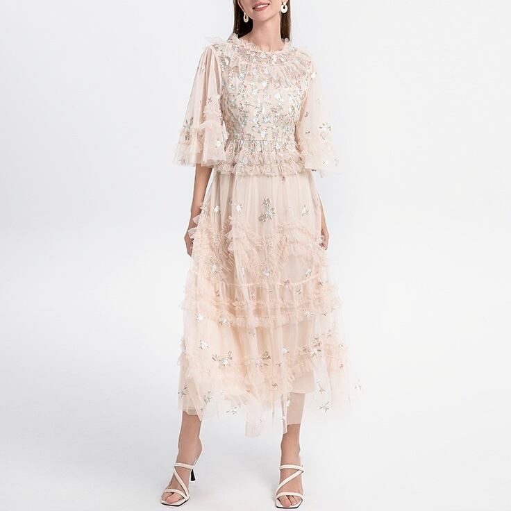 《訳ありアウトレット》送料無料 ◆ D2256 フラワー 刺繍 ティアード ラッフルフリル 7分袖 フレアスリーブ ロング ワンピース 《 アイボリー×パステル 》 長袖 オフホワイト アイボリー ベージュ 裏地あり インポートワンピース パーティードレス メール便 フリル パーティー 結婚式 お呼ばれ シアーワンピース 長袖 ワンピース 同窓会 謝恩会 ドレス 膝丈 マキシ ロング 発表会 卒業パーティー 刺繍ドレス レースワンピース 訳ありアウトレット わけあり 訳あり