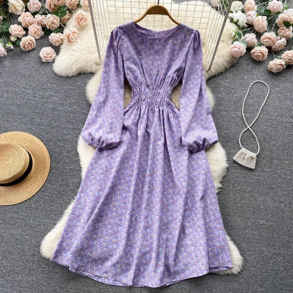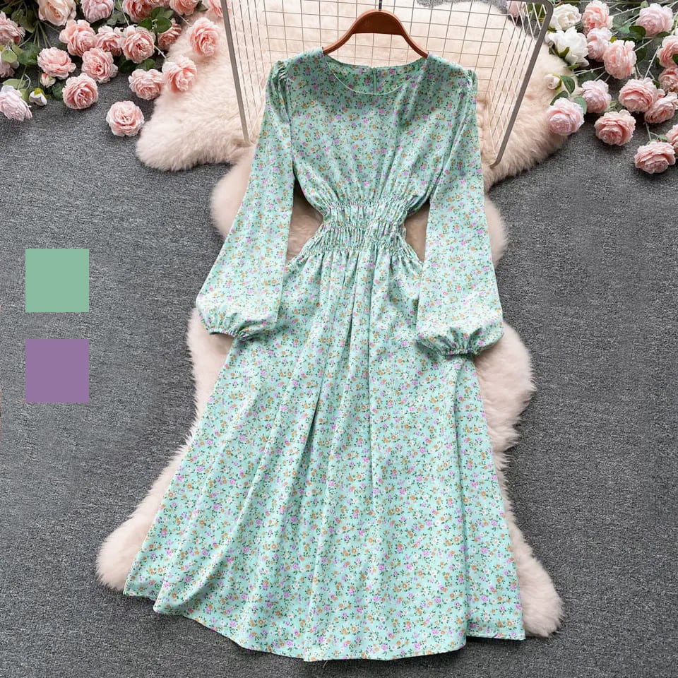 《訳ありアウトレット》 ◆ D1432 花柄 バルーンスリーブ ウエストシャーリングゴム ラウンドネック ロング ワンピース《 ミントグリーン・ラベンダー 》花柄ワンピース フラワーワンピース 小花柄 クラシカル 長袖 袖あり シャツワンピース インポート パーティードレス カラフル マルチ パープル 紫ワンピース 紫 ラベンダー ワンピース メール便 パーティーワンピ お食事 おしゃれ インポートワンピース 衣装 膝下 かわいい カジュアル 訳ありアウトレット 訳あり