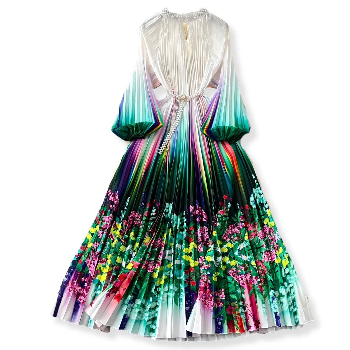 送料無料 ◆ D2476 パールベルト付き パールネック アコーディオンプリーツ バルーンスリーブ フレア ロング ワンピース 《 ホワイト×カラフル 》 グリーン マルチカラー 長袖 ロング カラフルドレス マキシ ミモレ 膝下 アンクル丈 クラシカル パーティードレス お呼ばれ 柄物 柄ワンピース メール便 パーティーワンピ 袖付き お呼ばれワンピース ロング ひざ丈 袖あり おしゃれ インポートワンピース お呼ばれ お出かけ 上品 衣装 爽やか 結婚式 同窓会 発表会 謝恩会