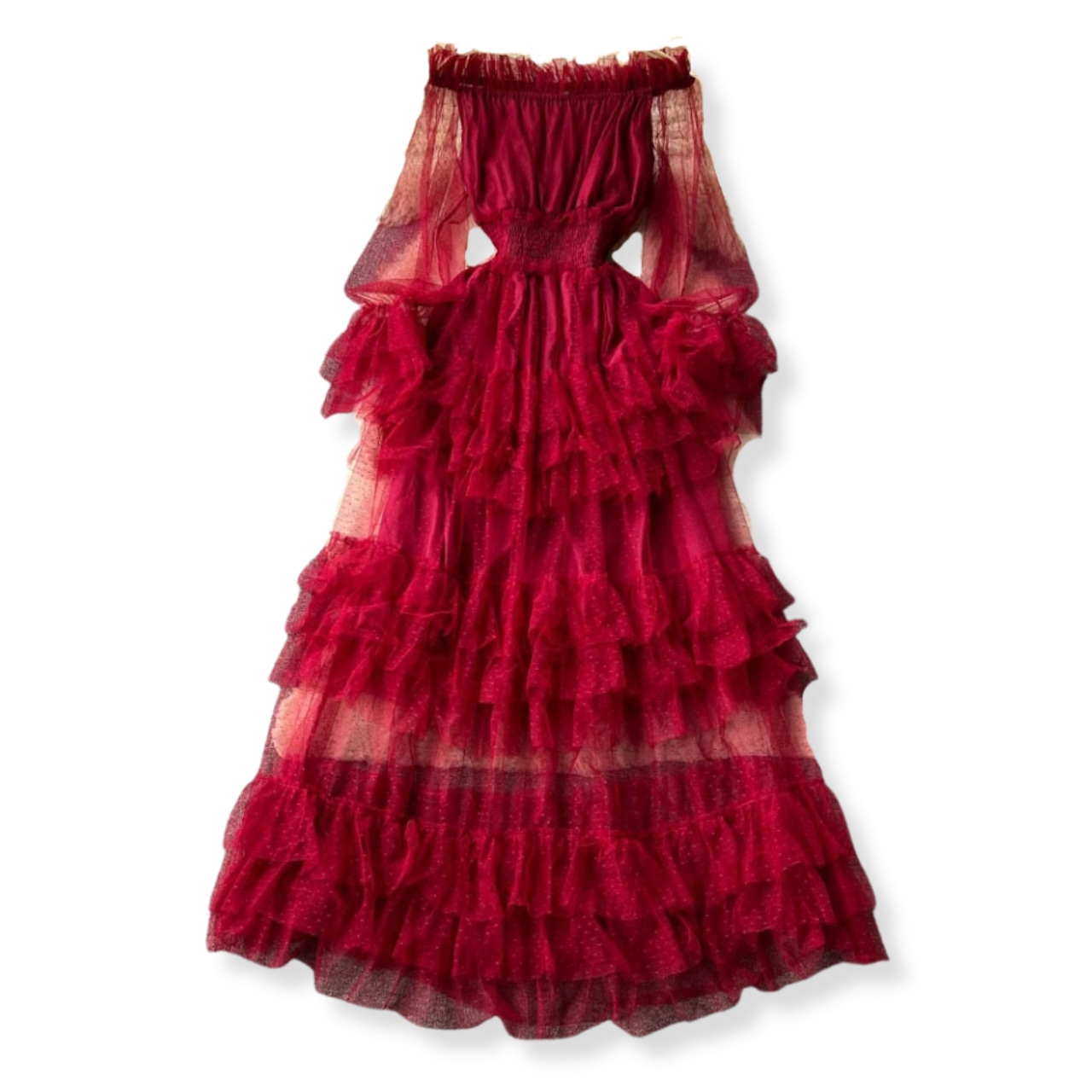 訳ありアウトレット 送料無料 ◆ D2432 チュール ウエスト シャーリングゴム ティアード オフショルダー 2way マキシ ドレス ワンピース《 レッド》 長袖 赤チュール 赤ワンピース ロング フロア丈 フロアレングス ティアードチュール チュールワンピース チュールワンピース フレア ワンピース ワンピース インポートワンピース 結婚式 パーティードレス パーティーワンピ 袖付き ドレス 衣装 膝下 袖あり 裏地付き 訳あり 訳あり品 わけあり ワケあり