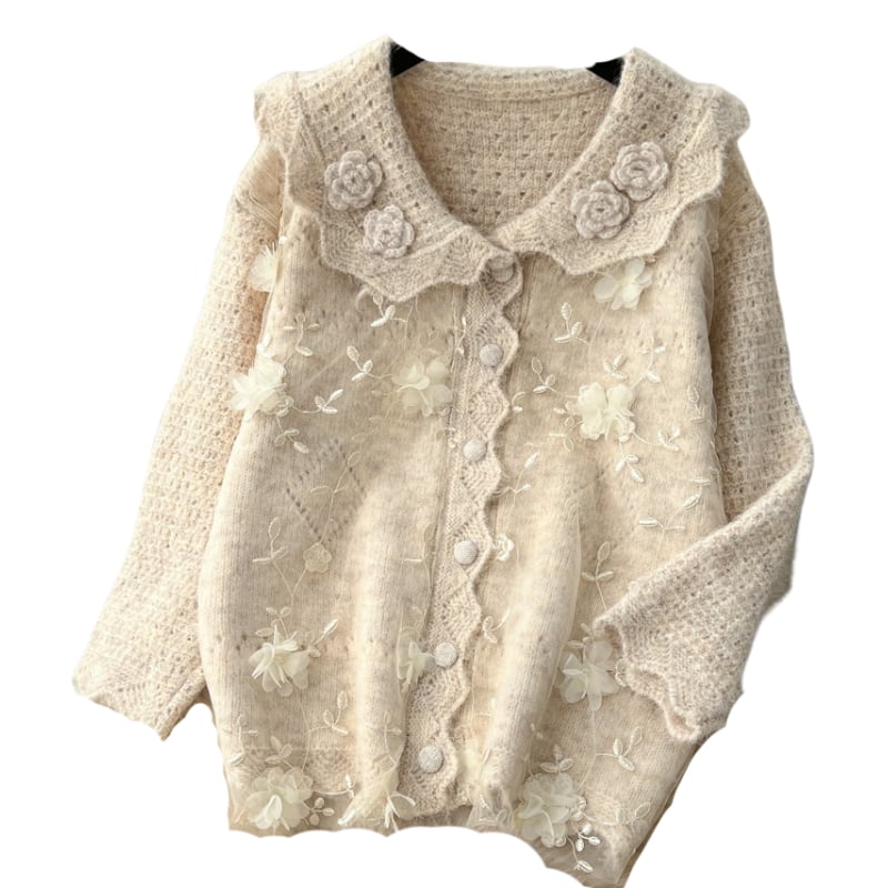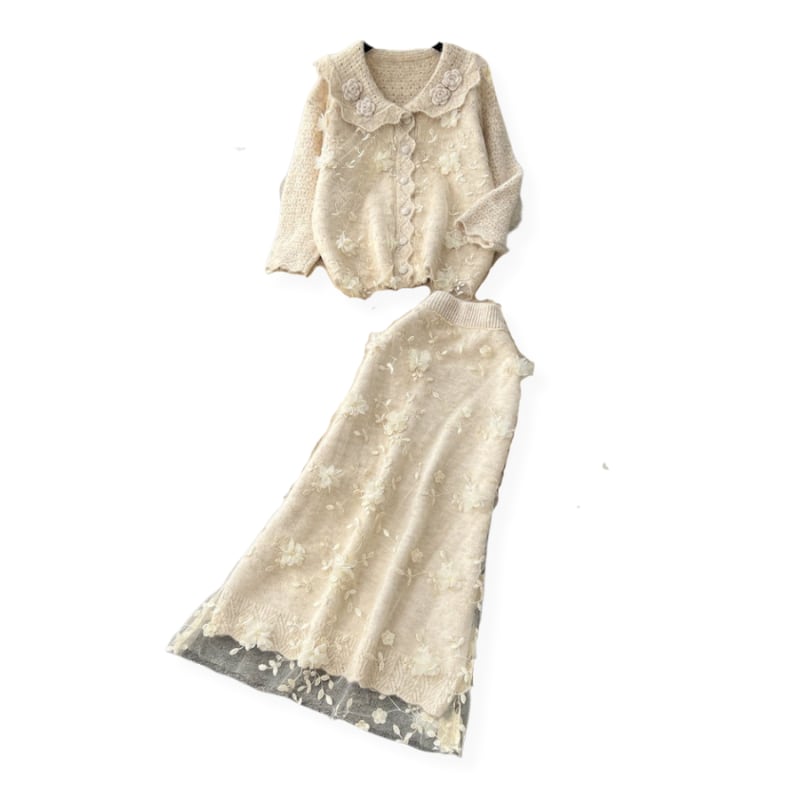 送料無料 ◆ D2505 フラワーモチーフ 刺繍 チュール × ニット セーラーカラー カーディガン & ロング スカート セットアップ 2点セット 《 オフホワイト 》上下セット ツーピース 2点セット セット コーデセット 上下 スカート 長袖 パープル 紫 ニットコーデ ウエストゴム トップス フリル チュール ティアード 襟付き プルオーバー ワンピース パーティードレス 2点 お呼ばれワンピース パーティーコーデ おしゃれ インポートセットアップ 衣装 チュールスカート