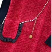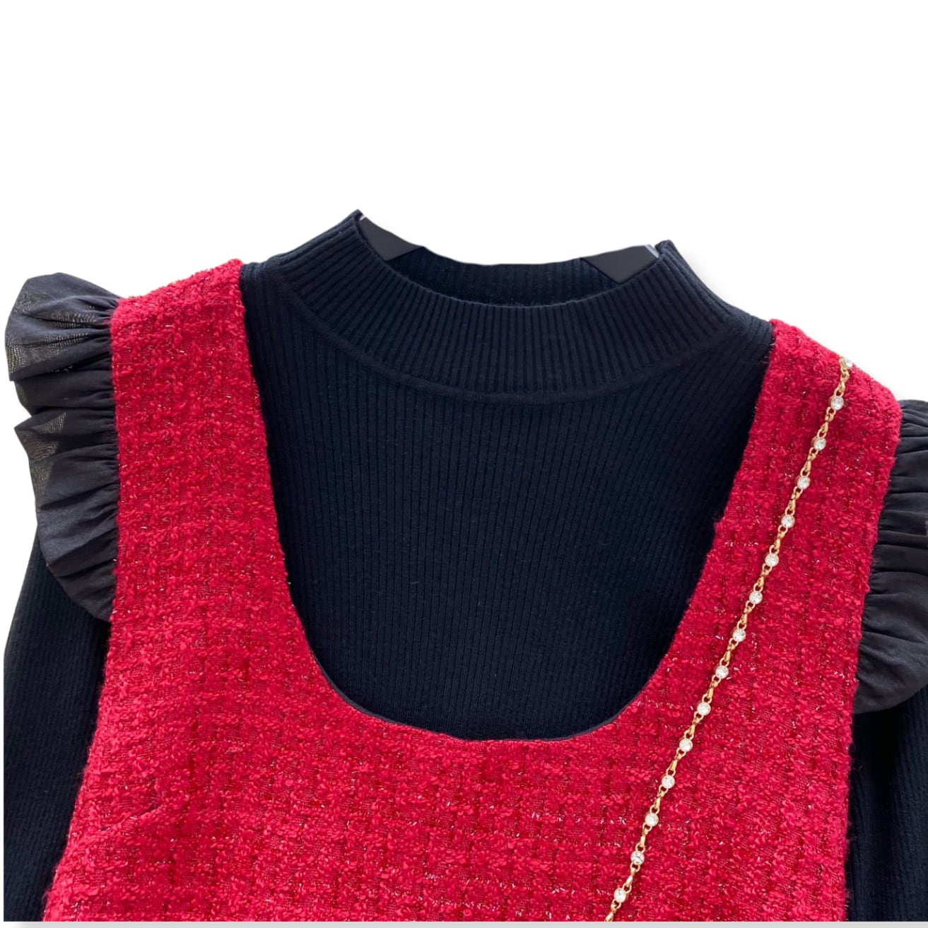 送料無料 ◆ D2507 2点セット ブラック ニットトップス & パール チェーン付き ラメ ツイード ミニ ワンピース 《ブラック×レッド》ブラック 長袖 ドレス ミニ ミニドレス 赤ワンピース キラキラ ツイードワンピース インポート パーティードレス お出かけ メール便 黒ワンピース パーティーコーデ お呼ばれ 袖あり インポートワンピース 衣装 発表会 結婚式 謝恩会 同窓会 クリスマス パーティー