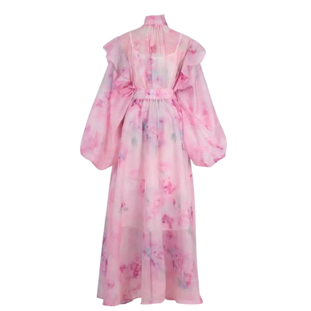 送料無料 ◆ D2509 3点セット フリルリボン付き ビジューボタン バルーンスリーブ ブラウス & マキシスカート セットアップ《ピンク》 3点 上下セット コーデセット コーデセット セットアップ シャツ マキシ フロアレングス ロングスカート クラシカル パーティードレス 柄物 パーティーワンピ 袖付き お呼ばれワンピース ロング 衣装 インポート ドット モノトーン オケージョン オケージョンドレス お呼ばれ スカート シャツ 発表会