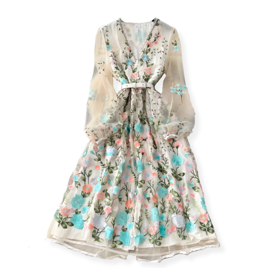 送料無料 ◆ D2510 ホワイトベルト付き 刺繍 フラワーレース Vネック パールボタン 前開き ロング ドレス ワンピース《 オフホワイト×ピンクミント 》長袖 花柄 花刺繍 総刺繍 袖ありレース お出かけ 膝下 お呼ばれ 結婚式 パーティードレス メール便 同窓会 発表会 謝恩会 オケージョン パーティー 結婚式 オケージョンドレス