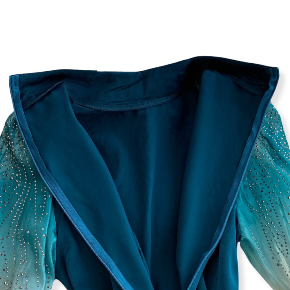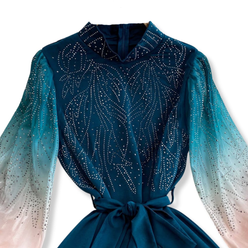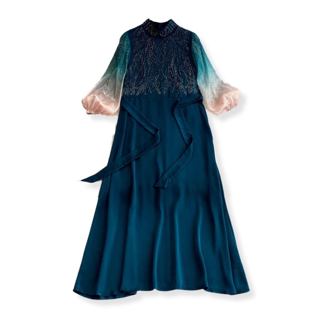 送料無料 ◆ D2533 リボン付き スタンドネック ビジュー グラデーション バルーンスリーブ 7分袖 ロング ワンピース《 ティールグリーン 》ダークグリーン クラシカル 袖あり 同窓会 謝恩会 ワンピース インポート パーティードレス 緑ワンピ 緑ワンピース メール便 パーティーワンピ おでかけ お食事 膝下 おしゃれ 袖あり インポートワンピース パーティードレス ロングワンピース 衣装 2点セット レースワンピ オケージョン