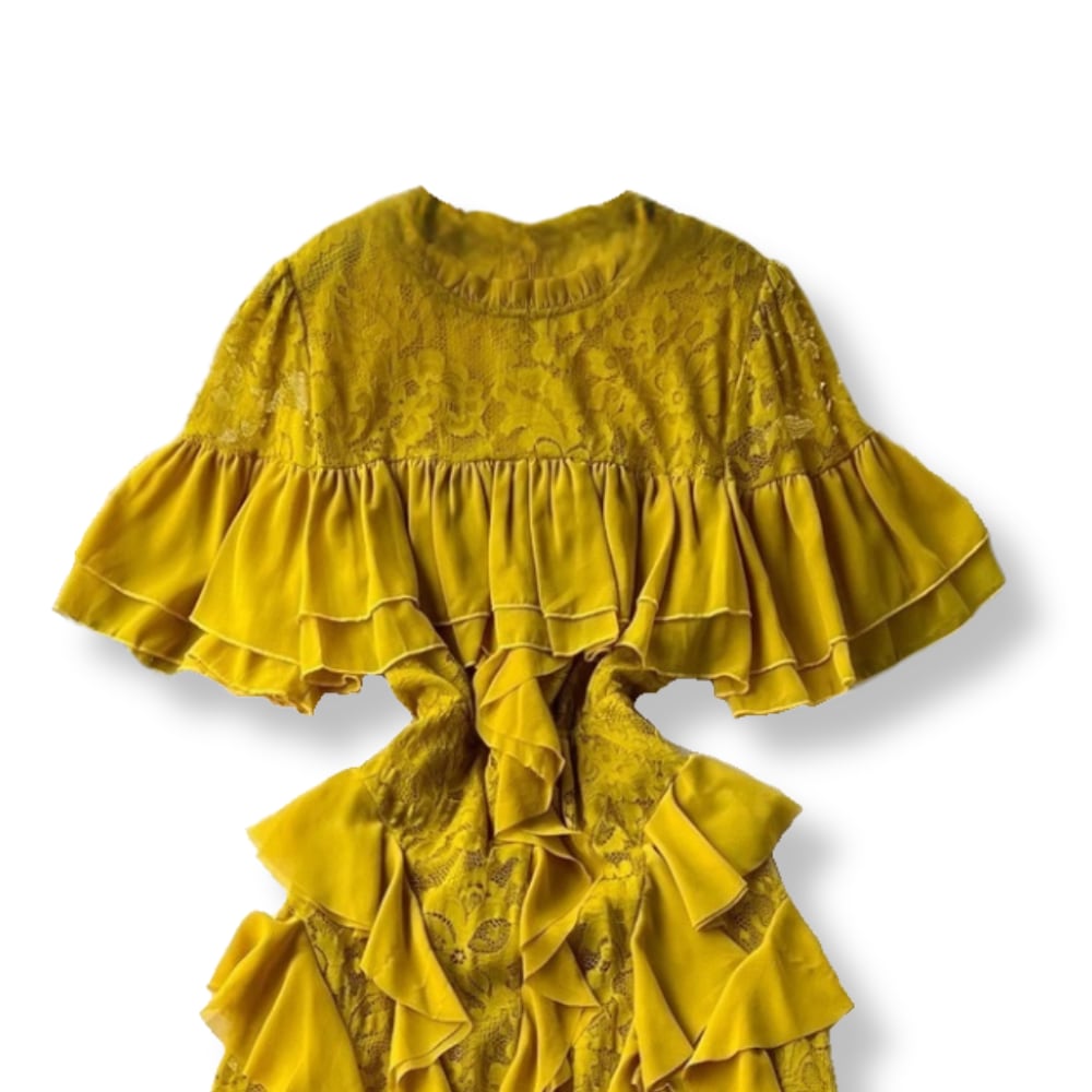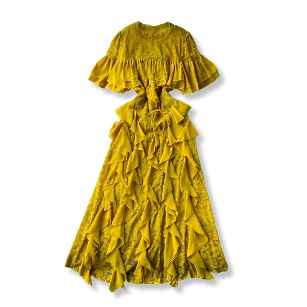 送料無料 ◆ D2546 ラッフルフリル × レース ケープスリーブ ウエストゴム ロング ドレス ワンピース 《イエロー》 黄色ドレス 黄色ワンピース 黄色 半袖 総レース フリルワンピース 袖あり 裏地付き 膝丈 膝下 ミモレ ミディ パーティードレス メール便 衣装 結婚式 お呼ばれ ドレス